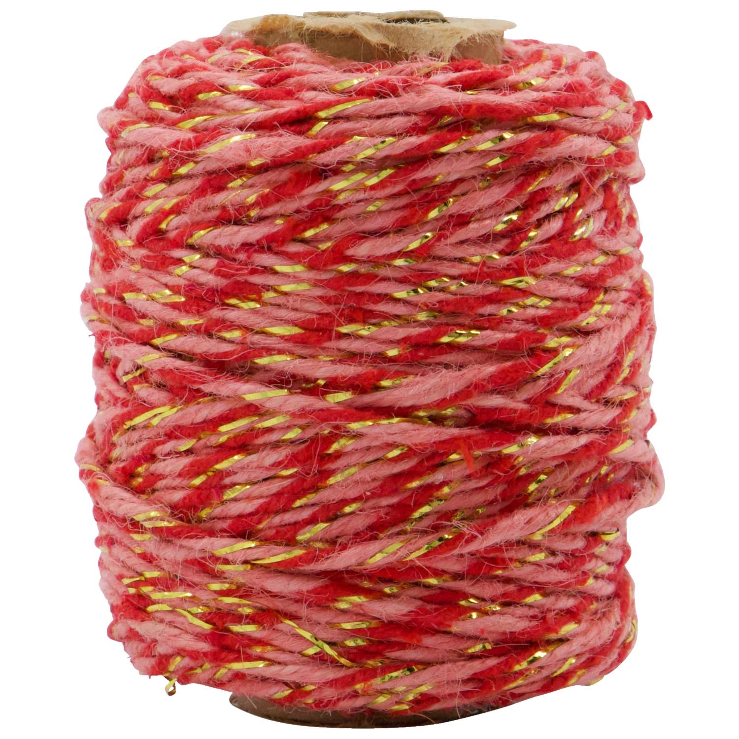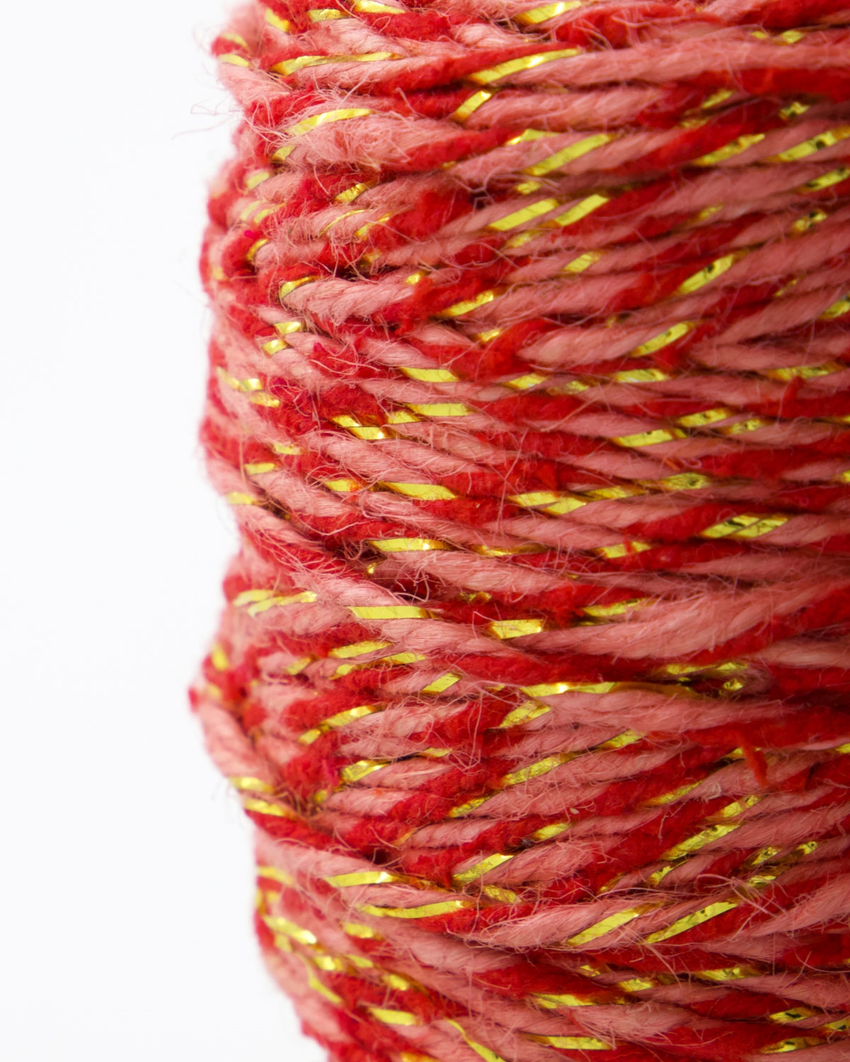 Dette bånd kombinerer røde og lyserøde nuancer med indvævede gyldne tråde, der giver et festligt udtryk. Den snoede tekstur skaber et rustikt look, som passer til både gaveindpakning og hjemmedekoration. Båndet leveres på rulle, klar til dine kreative projekter.