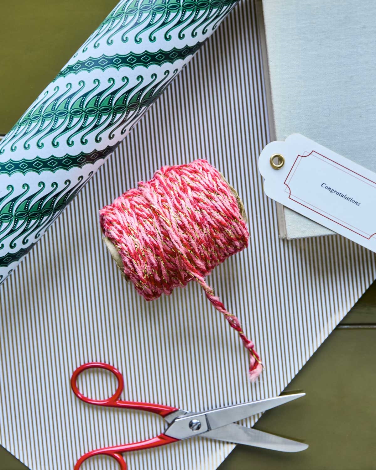 - Rødt bånd med gyldent lurex for festlig æstetik