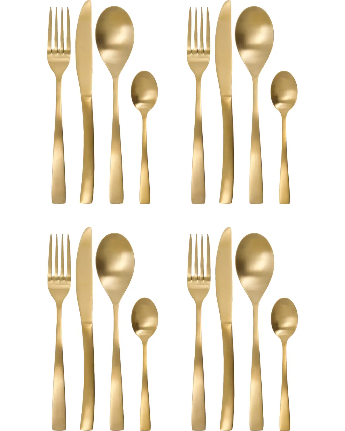 Giv din borddækning et sofistikeret og festligt præg med dette gyldne bestiksæt. Den varme glød og elegante finish gør hverdagsmiddage og særlige anledninger ekstra indbydende.- Eksklusiv gylden finish.- Materiale: Rustfrit stål.- Holdbar titaniumoxidbelægning.- Indeholder 16 dele.Perfekt til både hverdag og fest – løft din borddækning med et moderne twist.