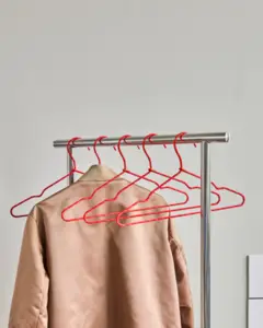 Dette sæt med 6 HDWire-bøjler i holdbart jern er belagt med en rød finish. Det slanke, holdbare design holder tøjet på plads og bidrager til et ryddeligt skab. - Sæt med 6 bøjler.- Fremstillet af slidstærkt jern.- Klar rød finish.