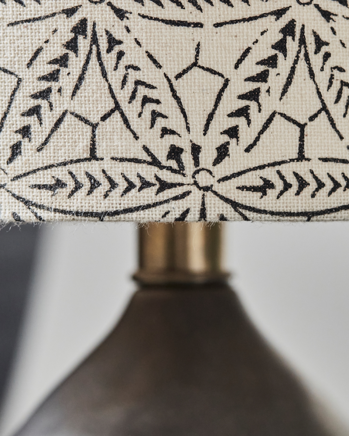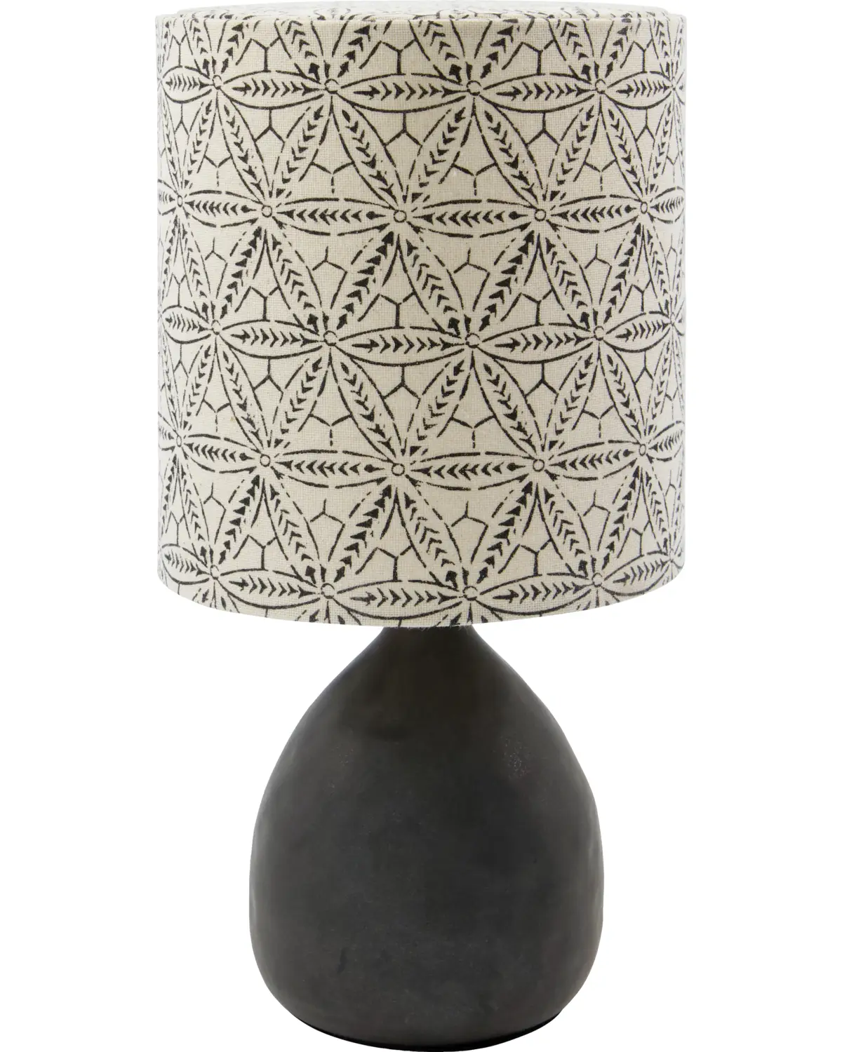 Tilføj et strejf af charme til dit hjem med denne bordlampe. Dens sorte stentøjs keramiske base giver et robust fundament, mens hørlampeskærmen har et håndtrykt etnisk mønster for en unik karakter. Perfekt til at skabe en hyggelig atmosfære på natborde, sideborde eller konsoller, denne lampe balancerer moderne stil med en indbydende atmosfære. - Sort stentøjsbund - Lampeskærm af hør - Håndtrykt mønster - Ideel til soveværelser Bring varme og stil til dit rum med denne elegante bordlampe.