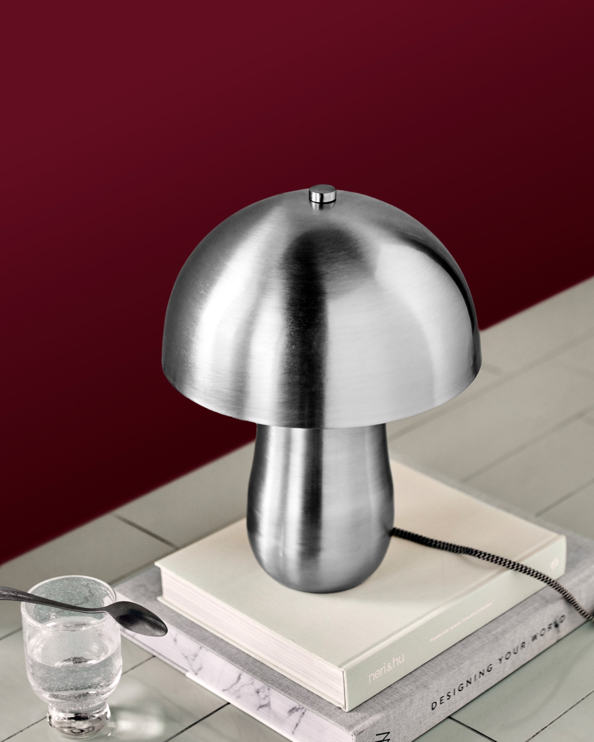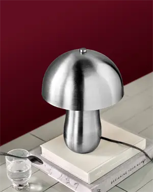 En bordlampe i børstet sølv med bløde linjer og håndlavet finish skaber både elegance og personlighed i dit hjem. Det skulpturelle design og den hvide inderskærm giver et varmt, blødt lys – som er oplagt på skrivebordet, natbordet eller som effektfuldt indslag i stuen. Ideel til dig, der ønsker moderne raffinement kombineret med funktionelt lys.- Håndlavet design i jern.- Børstet sølvfinish.- Blødt og indbydende lys.- Skulpturel, kuppelformet top.Sæt den i centrum, og oplev, hvordan et unikt lysforløb fuldender din indretning.