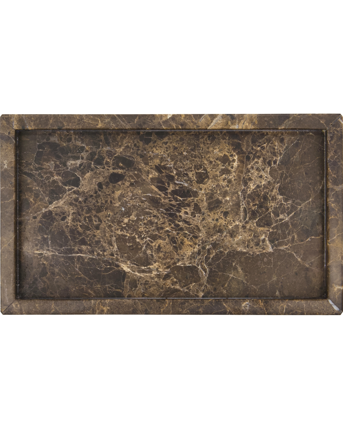 Elegant marmorbakke i smukke, brune nuancer med naturlige årer giver et eksklusivt touch til din boligindretning. Den hævede kant sørger for, at dine dekorationer altid står sikkert og stilfuldt på plads.- Håndskåret, massiv marmor.- Hver bakke er unik.- Praktisk høj kant holder styr på småting.- Luksuriøst, moderne udtryk.Anvend som base for parfumer, lys eller smykker – eller forkæl dig selv med et raffineret serveringsfad.