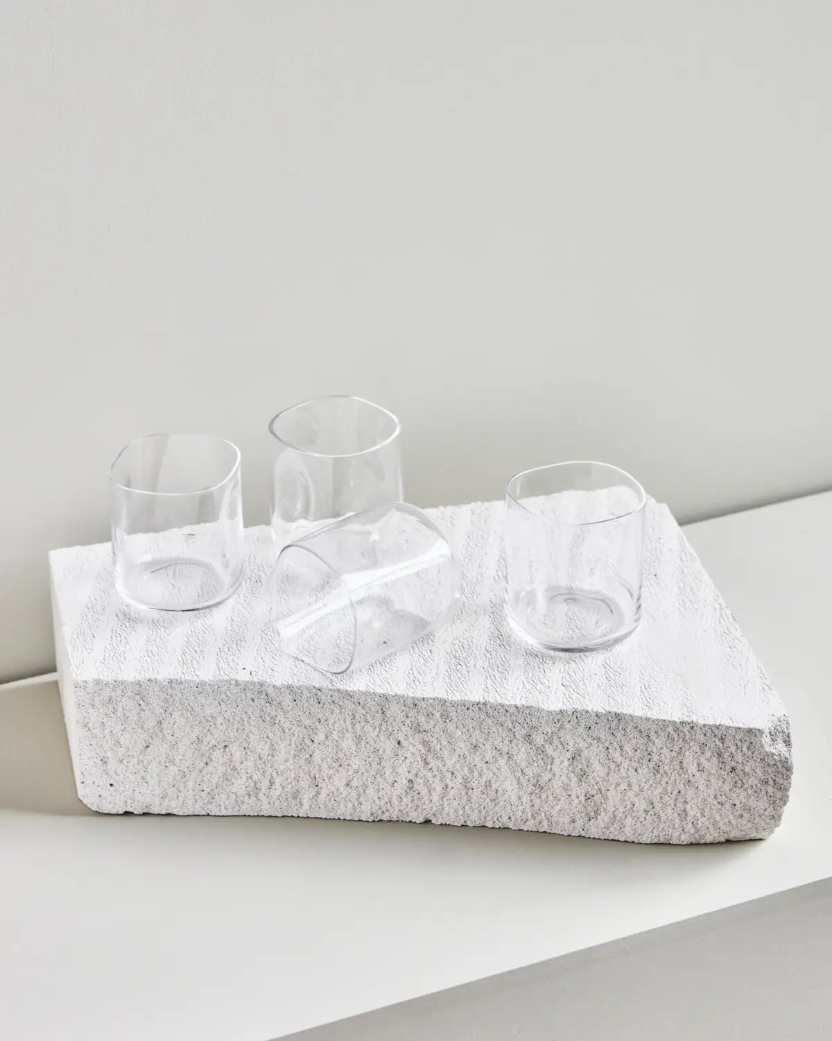 Dette sæt består af fire klare glas med en organisk, bølget overflade, der ligger godt i hånden. Glassene er fremstillet af presset, mundblæst glas.- Sæt med fire stk.- Organisk, bølget overflade.- Mundblæst glas.- Afslappet og moderne look.