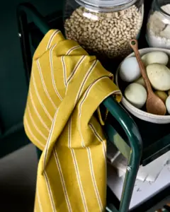 Løft din køkkenstil med dette forklæde, der har en sennepsbund og elegante råhvide og sorte striber. Lavet af 100% bomuld, dets praktiske og tidløse design gør den til et must-have til ethvert køkken. Med den ekstra sikkerhed for Oeko -Tex-certificering er det den perfekte blanding af stil og selvtillid. - Sennepsfarve med striber - 100 % bomuld - Tidløst design - Oeko -Tex certificeret Bring et strejf af elegance til din madlavningsrutine .