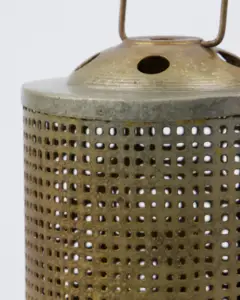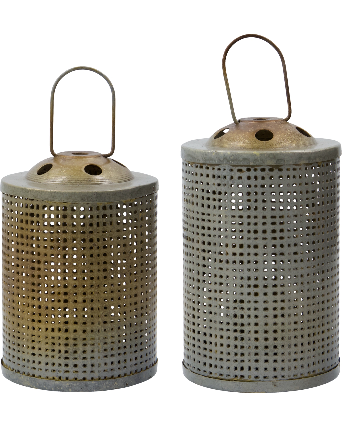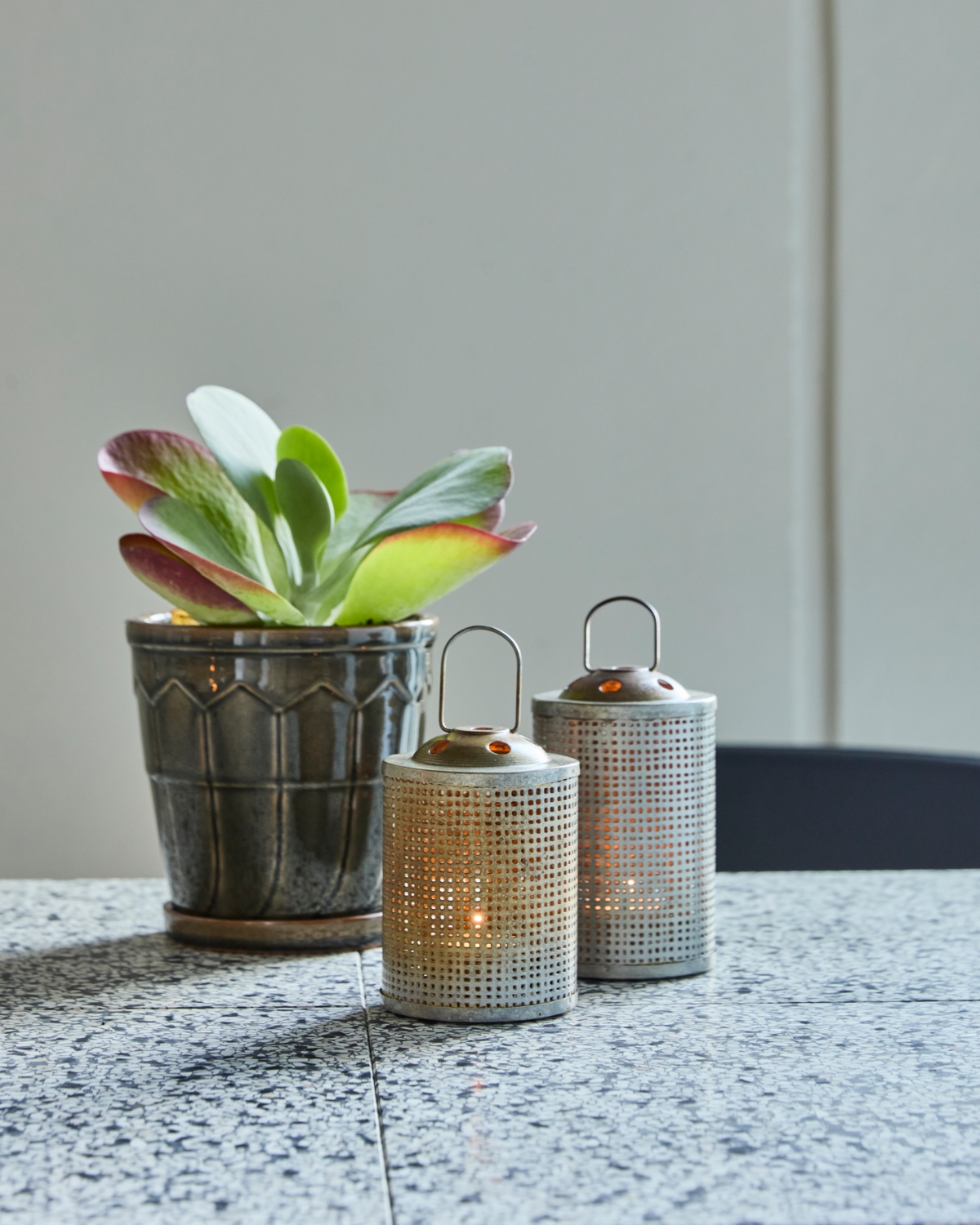 Sæt med to fyrfadsstager, der er fremstillet af perforeret jern med en smuk, antik messingfinish. Mønsteret filtrerer lyset og skaber et blødt og hyggeligt skær i rummet.- Sæt med to.- Antik messingfinish.- Perforeret, industrielt design.- Fremstillet i jern.