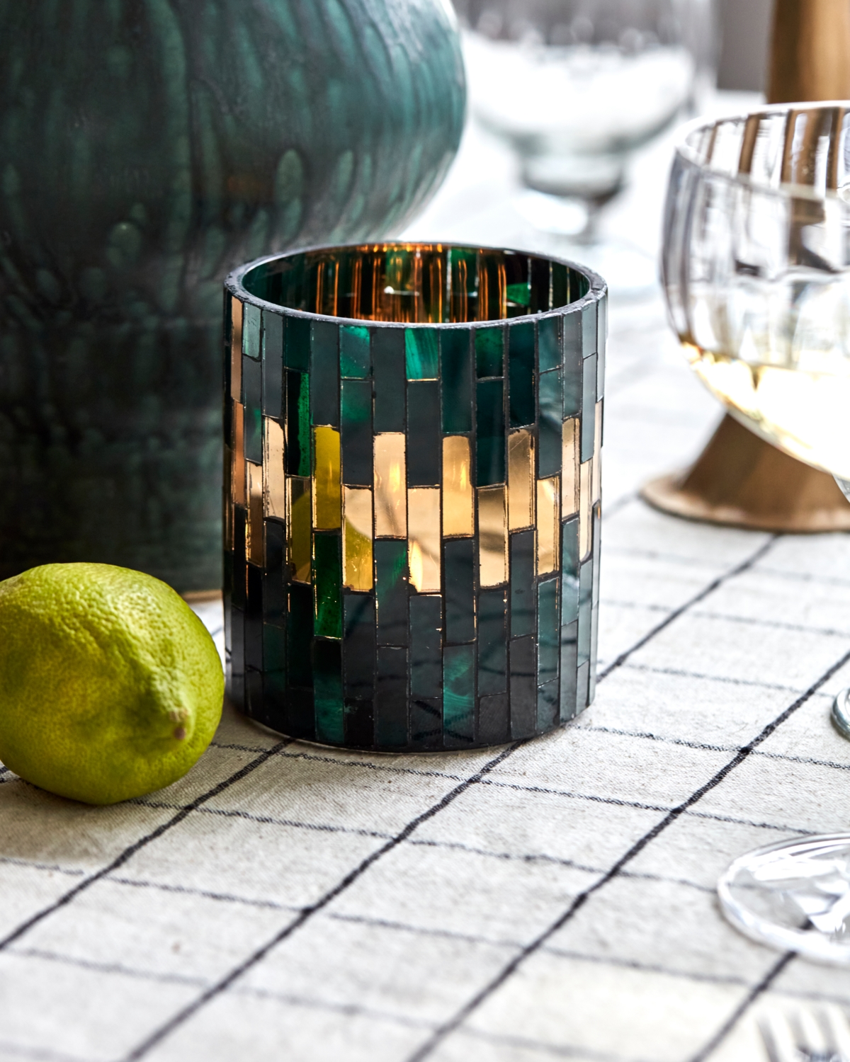 Tilføj et strejf af varme og charme til din indretning med denne udsøgte fyrfadsstage. Denne håndlavede fyrfadsstage er udformet med indviklede grønne og gyldne glasmosaikker og udstråler en hyggelig atmosfære. Dens alsidige design gør den perfekt til dit havebord, din balkon eller som et dekorativt element på en bakke.- Håndlavet design i mosaikglas.- Grønne og gyldne farver.- Alsidige placeringsmuligheder.- Skaber en hyggelig atmosfære.Bring en følelse af stil og komfort ind i din bolig med denne smukke fyrfadsstage.