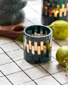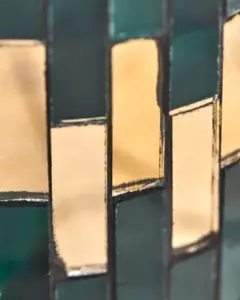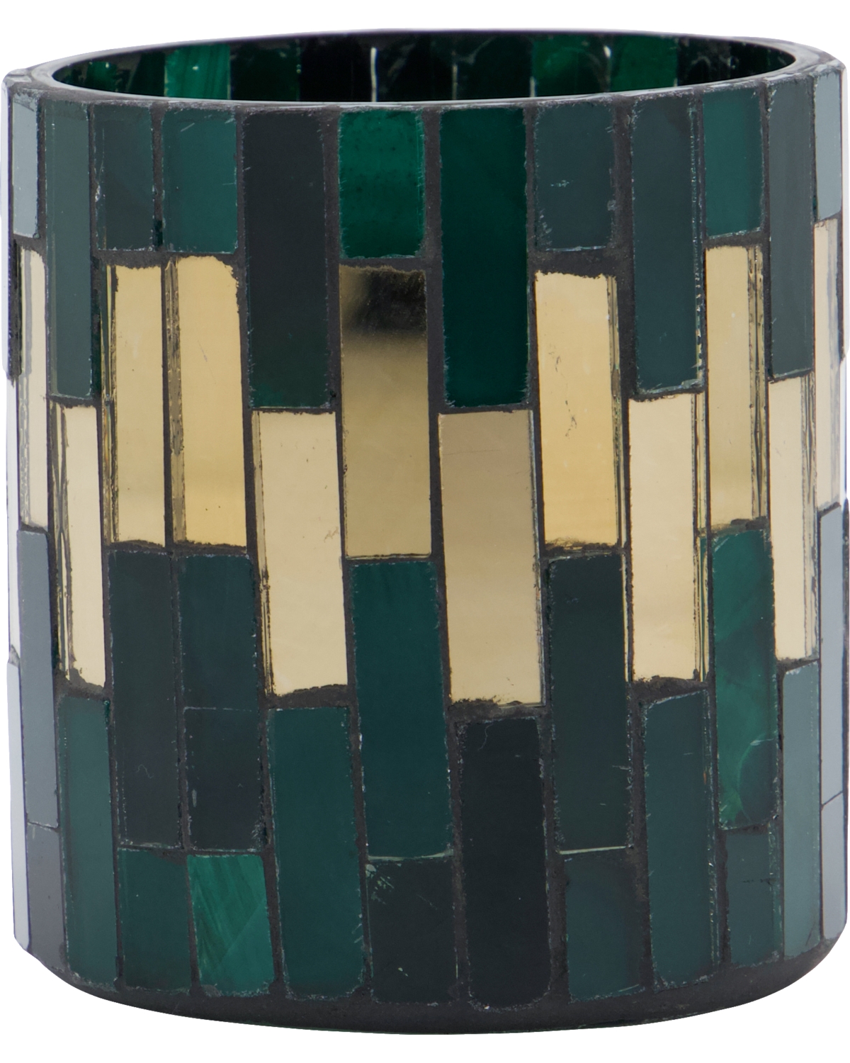 Denne fyrfadsstage er håndlavet med præcision og har et fantastisk mosaikmønster af grønt og gyldent glas. Hvert stykke har unikke variationer i finish, hvilket giver din indretning et personligt præg. Kombinationen af glas og cement giver både elegance og holdbarhed, hvilket gør den perfekt til ethvert miljø. Placer den på dit havebord, din balkon eller som et dekorativt element på en bakke for at skabe en hyggelig og indbydende atmosfære.- Håndlavet mosaikmønster- Unikke variationer i finish- Grønt og gyldent glasdesign- Ideel til hyggelige omgivelserTilføj et strejf af varme og charme til dit hjem med denne udsøgte fyrfadsstage.