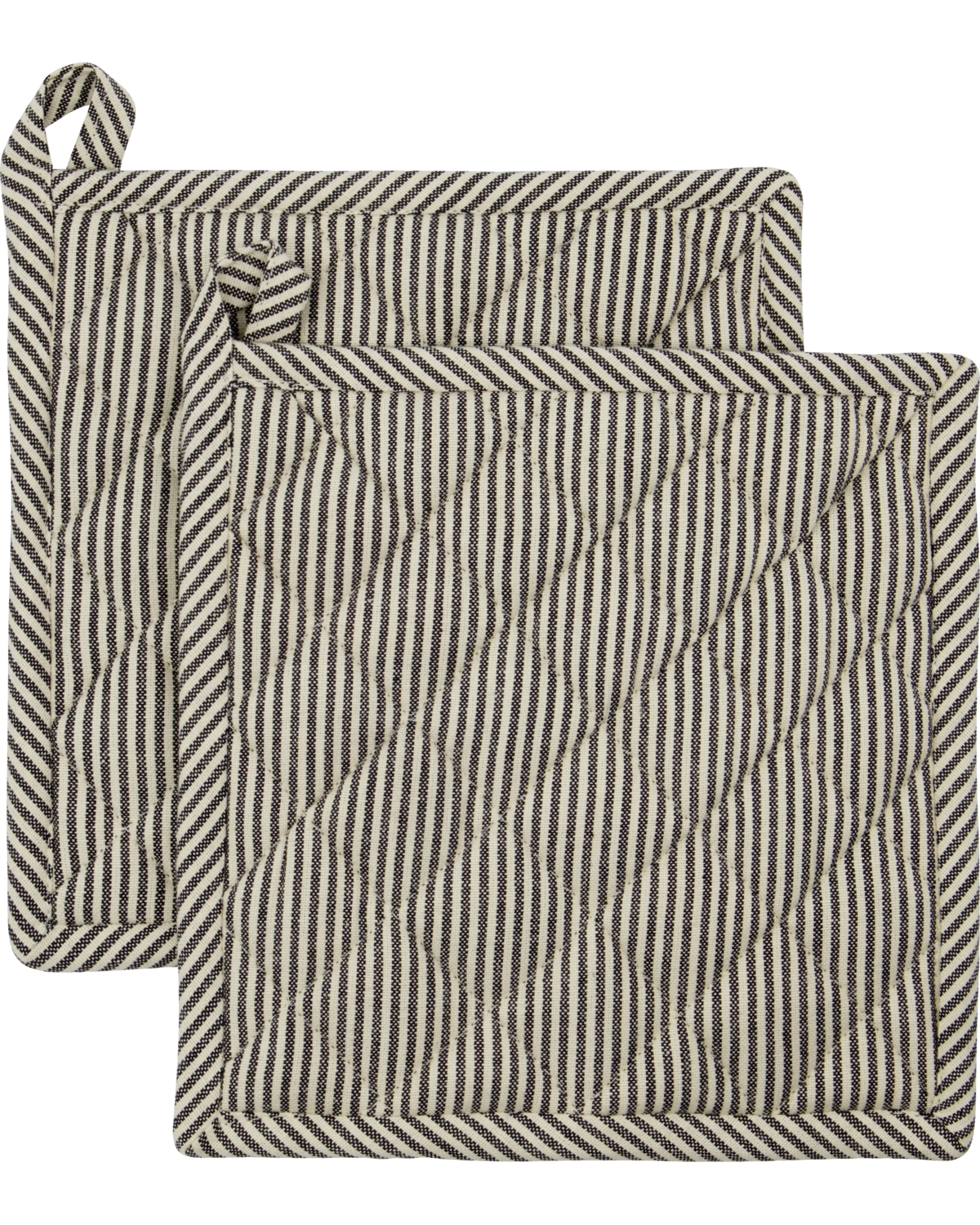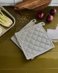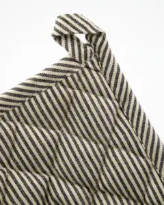 Giv dit køkken stil med dette sæt quiltede grydelapper i mørkegrå og råhvide striber.Det bløde, men robuste bomuldsstof beskytter hænderne, mens det tidløse design gør dem ideelle til daglig madlavning.Brug dem både til varme gryder, fade eller som underlag på spisebordet – og hæng dem let op i den diskrete løkke, når de ikke er i brug.- 100 % bomuld- Sæt med 2 stk.- Quiltet for varmebeskyttelse- Elegant stribet designFuldend madlavningen med stilfuldt og praktisk tilbehør, der passer ind i ethvert køkken.
