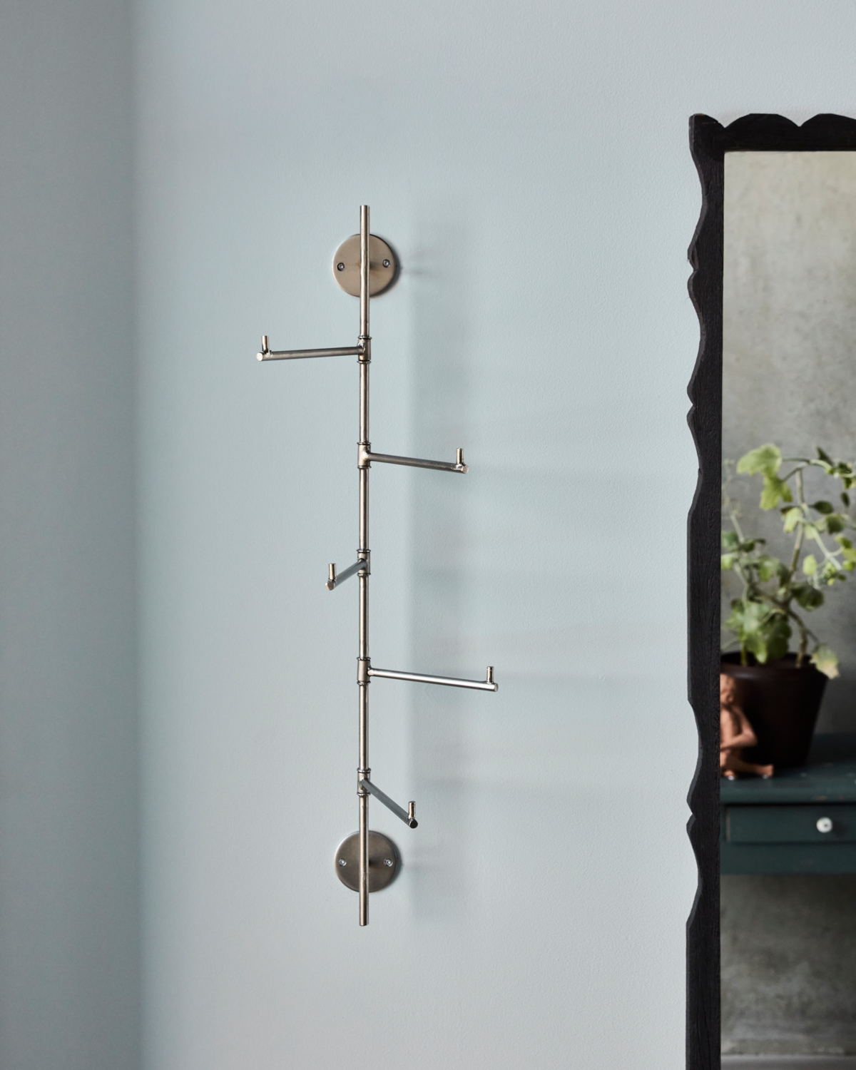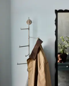 Håndlavet knagerække med elegant sølvfinish giver et skulpturelt udtryk i din entré eller garderobe. De fem kroge kan drejes og tilpasses til din hverdag – både smukt og praktisk i ét.- Fem drejelige kroge- Elegant sølvfinish- Håndlavet design- Robust jernkonstruktionSkab personlig stil og orden – hæng jakker, tørklæder eller tasker op med flair.