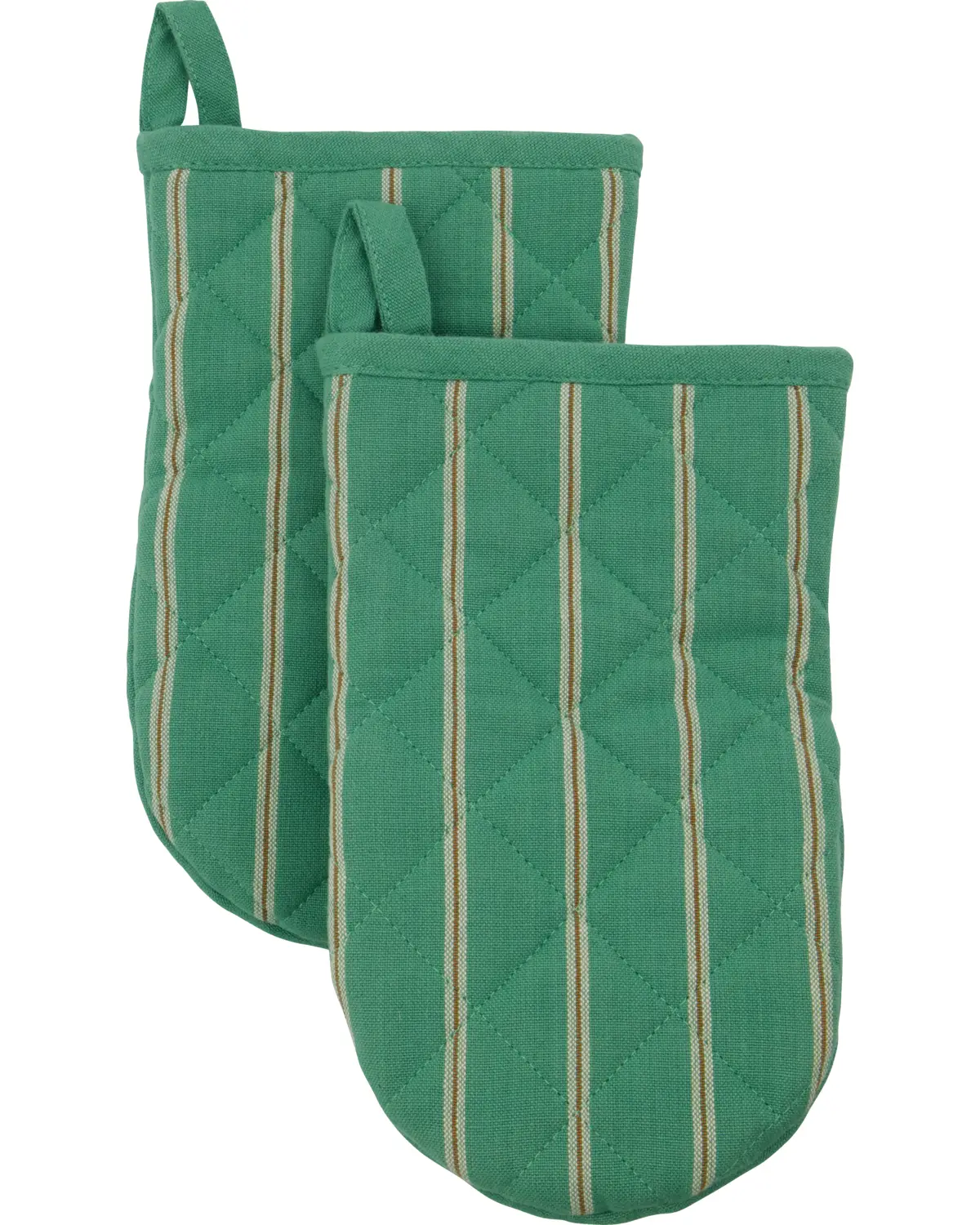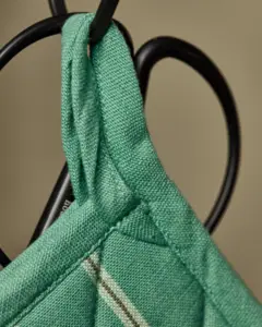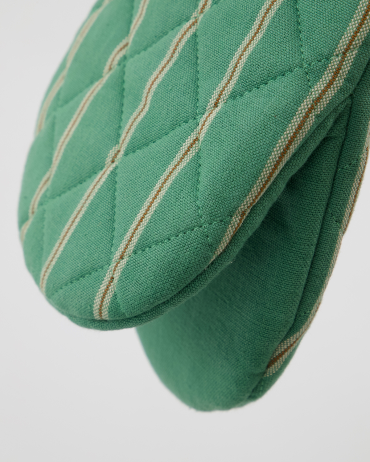 Skab et sofistikeret look i dit køkken med dette sæt af to elegante, grønne køkkenhandsker. Disse handsker er lavet af 100 % bomuld med et tykt quiltet design og giver fremragende beskyttelse, når du håndterer varmt køkkengrej. Den tidløse grønne farve med råhvide og brune striber komplementerer enhver køkkenindretning ubesværet. - Sæt med 2 køkkenhandsker - Quiltet design af høj kvalitet - Elegant grønt stribemønster - Oeko -Tex certificeret for kvalitet Tilføj et strejf af stil og sikkerhed til din madlavningsoplevelse.