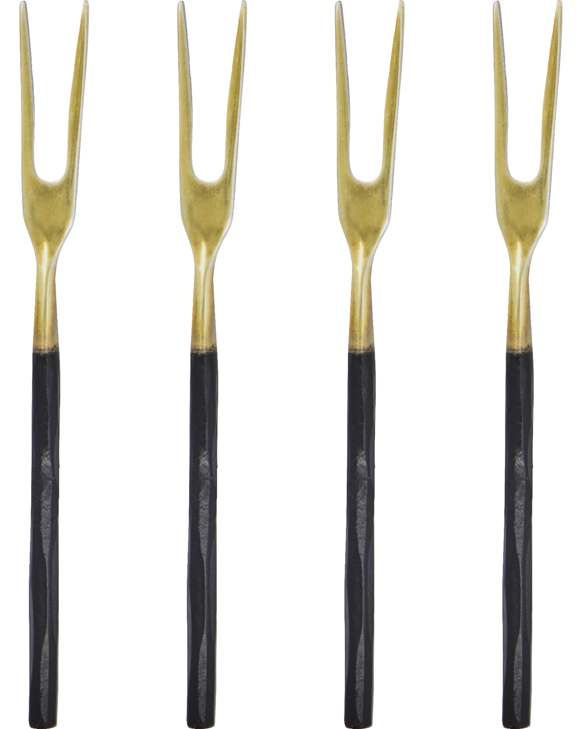 Et sæt på fire håndlavede gafler i antik messing giver dit bord et personligt og dekorativt udtryk.Det organiske design med sorte håndtag kombinerer unikke former og varme toner, der gør hver servering til en særlig oplevelse.Perfekte til tapas, delikate anretninger eller desserter – både til hverdagsaftener og middage med gæster.Lad de smukke gafler være prikken over i’et, uanset om du dækker op i stuen, på terrassen eller til festlige sammenkomster.- Håndlavet unikt design.- Sæt med 4 gafler.- Antik messingfinish og sort skaft.- Rustfrit stål for holdbarhed.Fuldend din borddækning med personlige detaljer, der inviterer til stemningsfulde måltider.