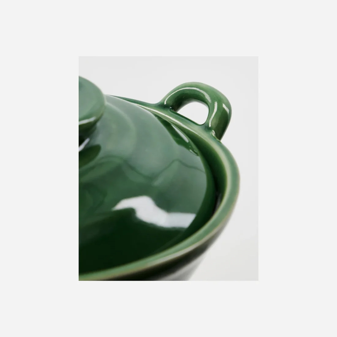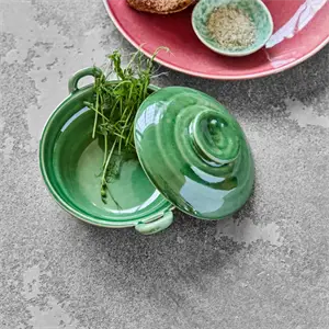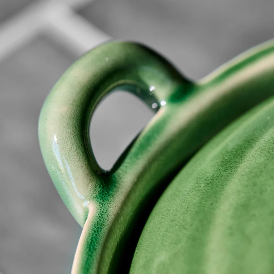 Stentøjsmaterialet gør krukken robust nok til daglig brug, mens det håndlavede udtryk betyder, at ingen to krukker er helt ens. Låget holder indholdet beskyttet, og grebene gør det nemt at flytte krukken rundt. Den dybgrønne glaserede finish fungerer i de fleste køkkener, uanset om du foretrækker en neutral eller farverig indretning.