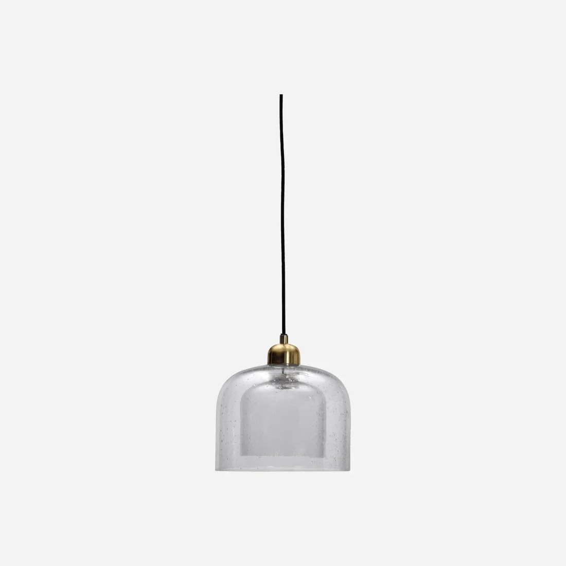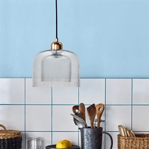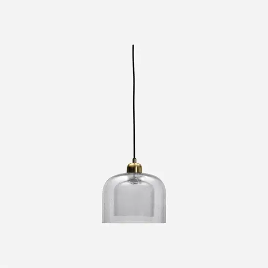 Denne pendellampe har en lampeskærm lavet af 100 % glas, der spreder lyset jævnt og tilføjer et moderne udtryk til dit rum. Glassens klare finish med synlige luftbobler giver lampen karakter, mens den messingfarvede top skaber en subtil kontrast til den sorte ledning.