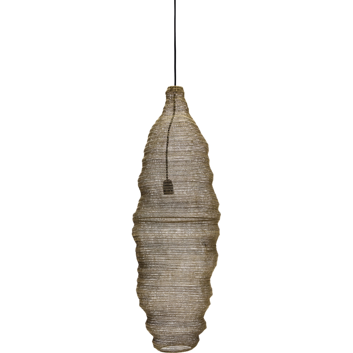Skil dig ud med en pendel i antikt champagne-sølv, hvor mesh i håndlavet jern fanger lyset og spreder varme i hele rummet. Den lange, ovale form med bølgede kanter giver lampen et kunstnerisk twist og skaber et moderne udtryk med et hint af boheme. Lampen skaber en rolig, stemningsfuld atmosfære og bliver hurtigt et samtaleemne over spisebordet, i stuen eller som blikfang i entréen.- Håndlavet mesh i jern.- Elegance i champagne-sølv.- Bølgede, organiske kanter.- Perfekt til moderne indretning.Fuldend dit hjem med lys, der gør indtryk – hæng lampen op alene eller sammen med andre lyskilder for at sætte et personligt præg.