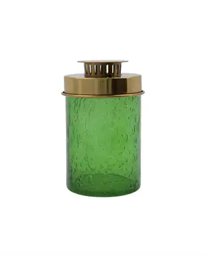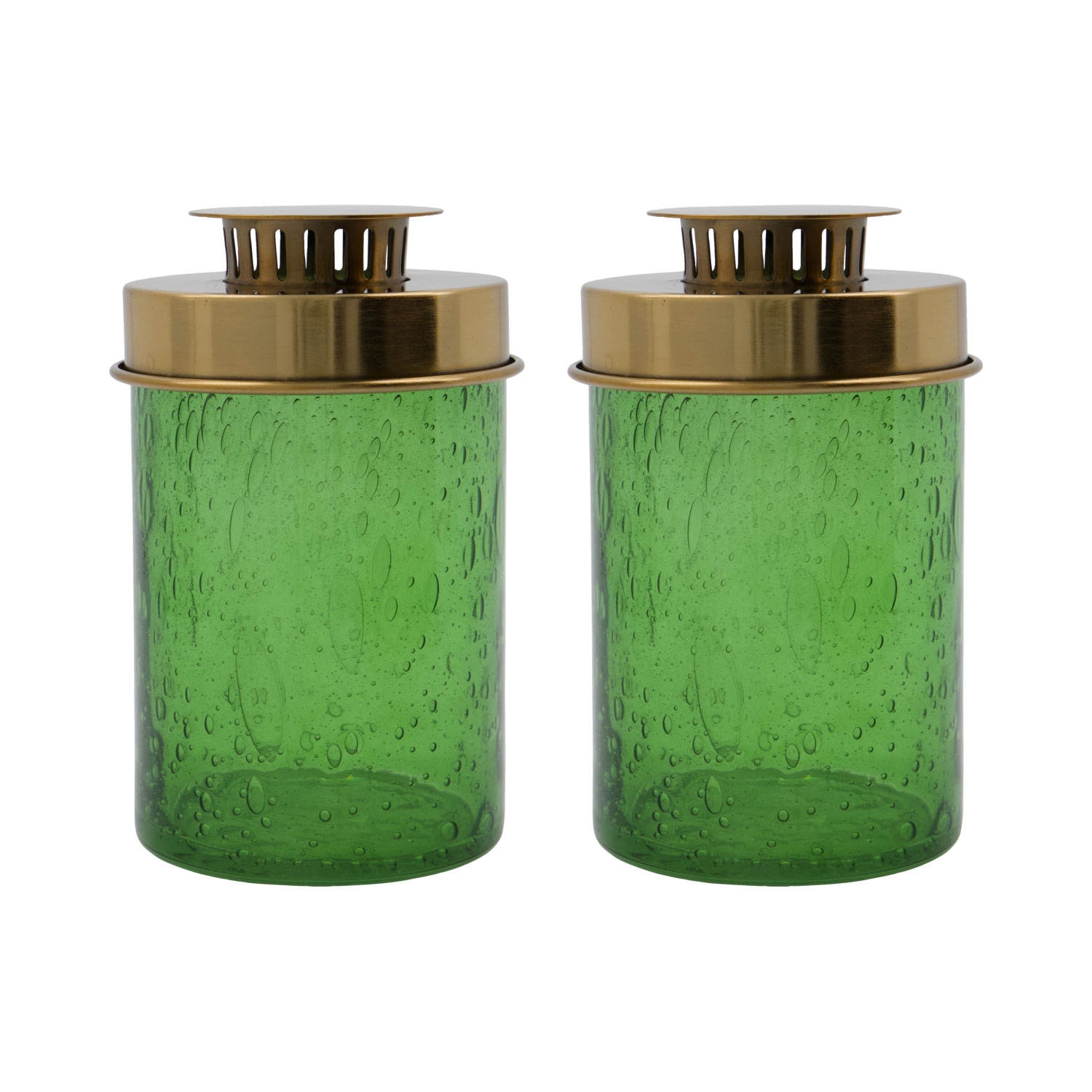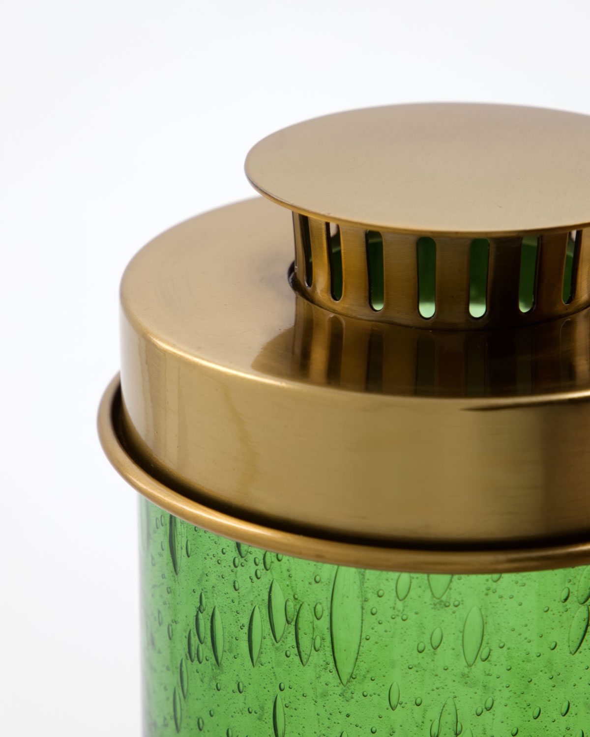 Dette sæt består af to fyrfadslysestager i grønt bobleglas, der tilføjer karakter til dit hjem. Glasset er mundblæst, hvilket giver hver lanterne en særpræget bobleeffekt – ingen to er helt ens. Låget har en messingfinish, der skaber et vintage-look og fungerer som en praktisk beskyttelse mod træk.