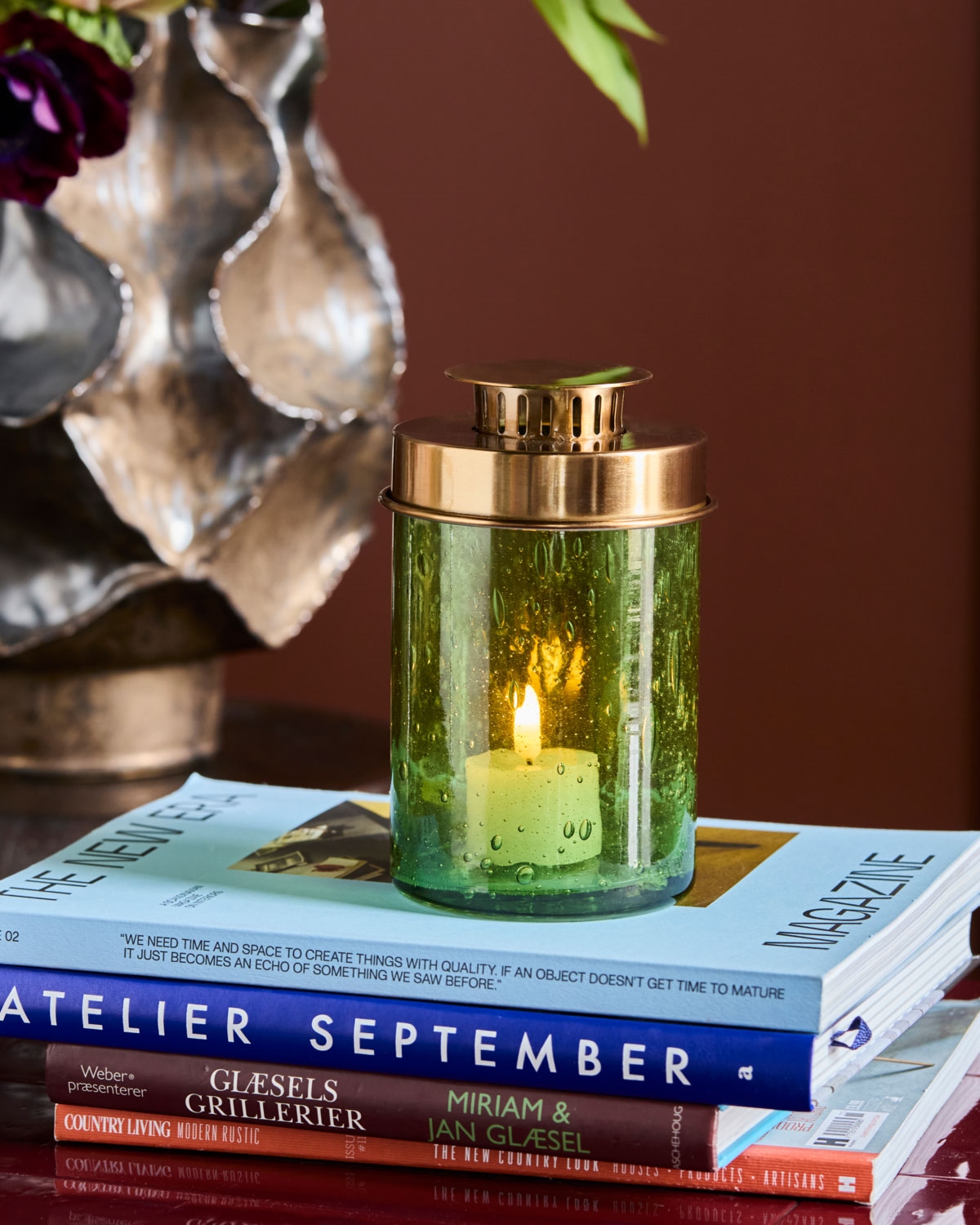 Messingfinishen på låget er ikke kun dekorativ; den tilføjer også en robust konstruktion, der holder over tid. Det mundblæste glas med sin teksturerede overflade fanger lyset på en særlig måde, så lanternerne fungerer som skulpturelle elementer, selv når de ikke er tændt. Du får to størrelser, der kan stå sammen eller hver for sig.