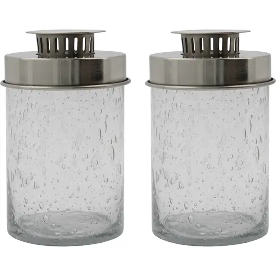 Dette sæt indeholder to fyrfadsholdere lavet af klart mundblæst bobleglas, der afspejler håndværksmæssig kvalitet. Hver lanterne har sit karakteristiske boblemønster, og lågene er fremstillet i sølvmetal. Højden på 18 cm giver en god lysspredning i rummet.