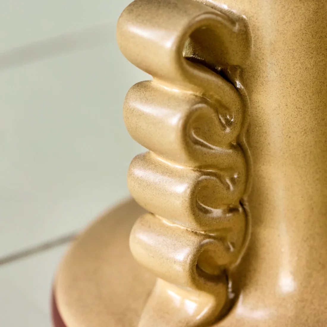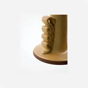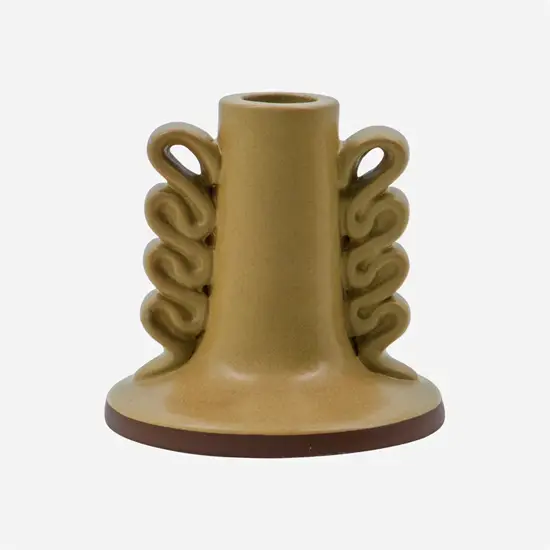Denne lysestage er fremstillet af 100 % stentøj, et materiale berømt for sin holdbarhed og robusthed. Håndlavet med buede, kunstneriske detaljer på siderne giver den en særlig karakter, der adskiller sig fra masseproducerede alternativer. Den sandfarvede glaserede finish tilføjer en naturlig varme til dit hjem.