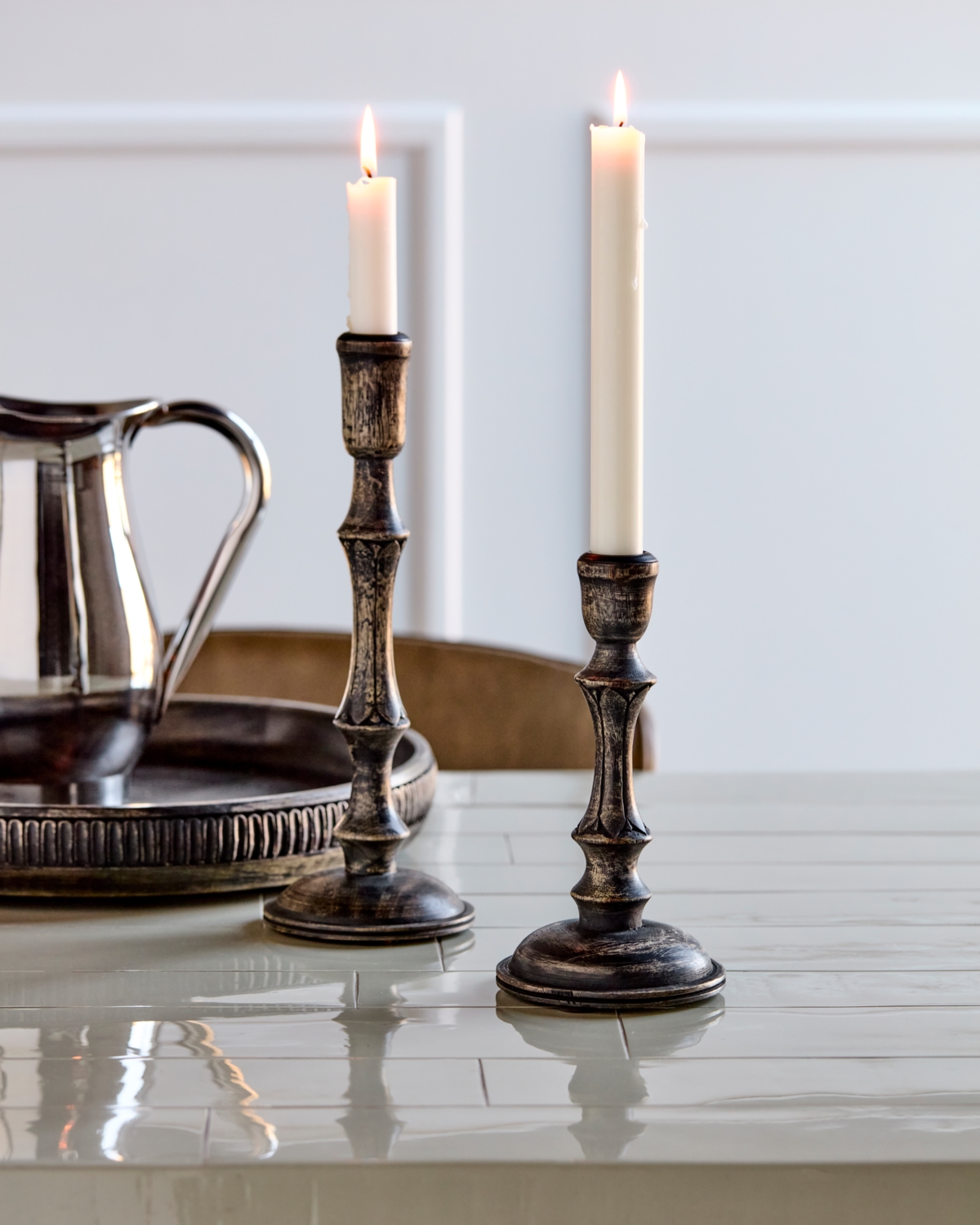 Lysestager i klassisk sort bringer tidløs elegance og varme ind i dit hjem. De er håndlavet i mangotræ og farvet med sort bejdse, og de giver et levende og sofistikeret udtryk til din indretning. Sættet med 2 stk. passer perfekt på sofabordet, på spisebordet eller i vindueskarmen og skaber hyggelig stemning uanset placering. Du kan nemt kombinere dem med metallysestager for at sætte et personligt præg på din borddækning.- Sæt med to enheder.- Håndlavet mangotræ.- Sortbejdset finish.- Klassisk design, tidløs stil.Skab stemning og udtryk med smukke lysestager i hele dit hjem.