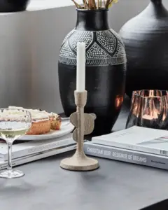 Giv din boligindretning et strejf af kunst med denne elegante lysestage. Den er fremstillet i støbt aluminium med en betagende beige finish og har et moderne design, der også fungerer som et dekorativt element. Den strukturerede overflade og unikke form gør, at den skiller sig ud, uanset om den placeres på et spisebord eller en kaminhylde, og giver både stil og funktionalitet til din bolig. Dens alsidige og moderne æstetik gør den velegnet til forskellige indretningsstile og tilfører varme og raffinement til ethvert rum.- Kunstnerisk moderne design- Holdbart støbt aluminium- Elegant beige finish- Alsidigt dekorativt stykke Brug denne unikke lysestage i din boligindretning for at skabe ekstra stil og raffinement.