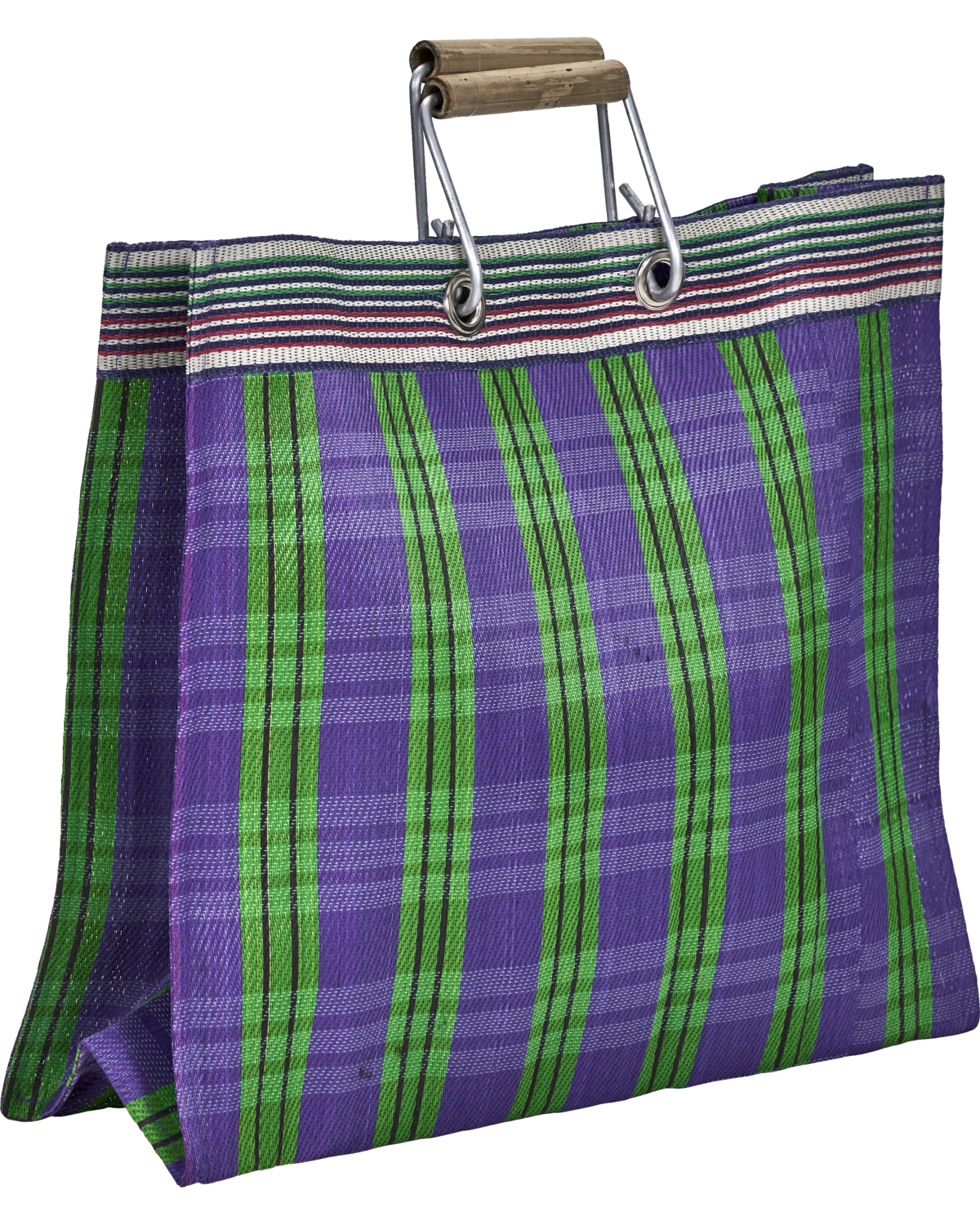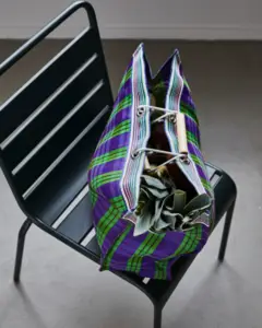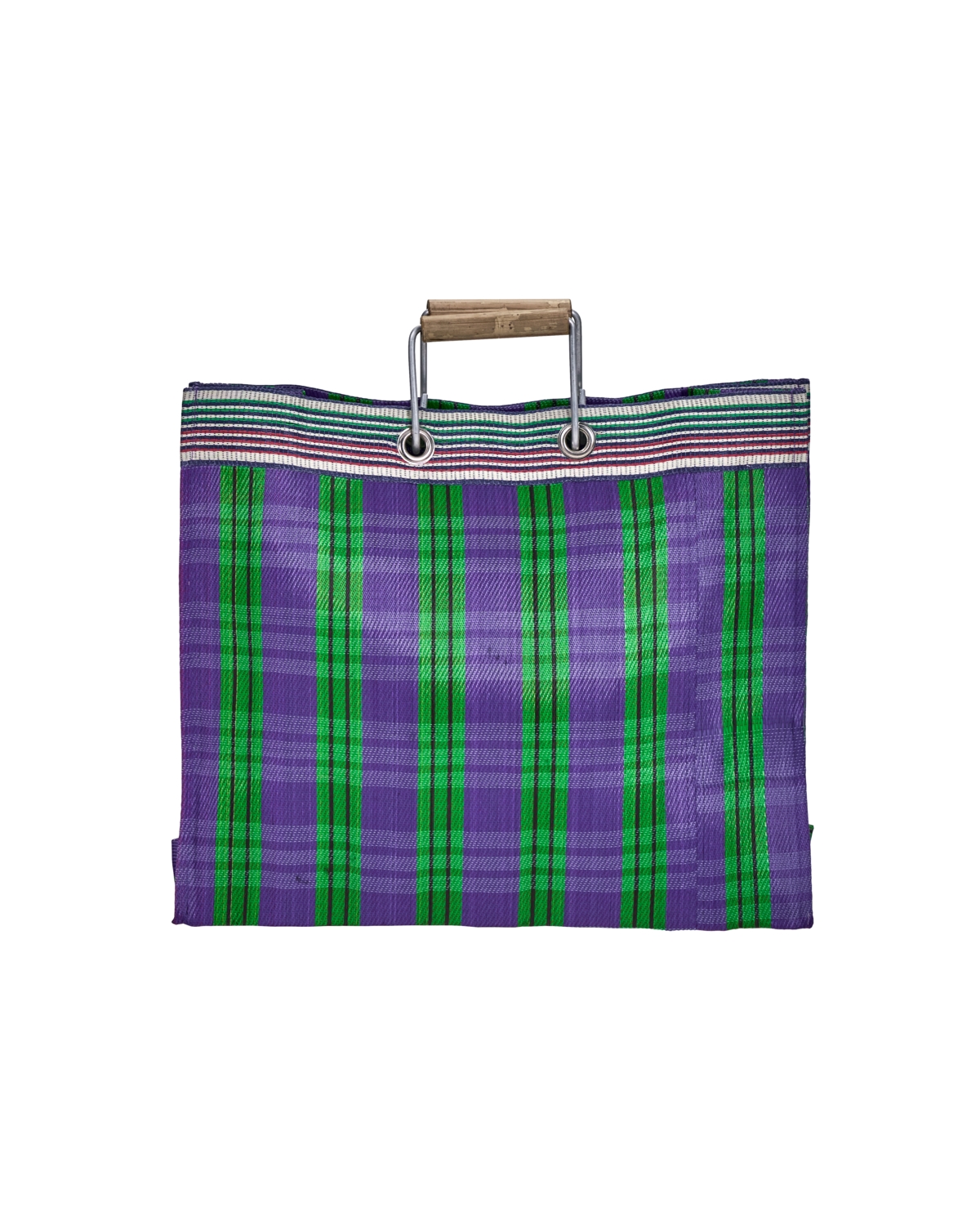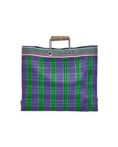 Sæt kulør på din dag med denne livlige lilla taske. Den er fremstillet af genanvendt polypropylen og har et robust design, der gør den til et praktisk valg til de daglige ærinder. Det markante grønne og lilla ternede mønster, der suppleres af et stribet bånd i toppen, fanger ubesværet opmærksomheden. Bambushåndtagene giver et behageligt, naturligt greb og tilføjer et elegant touch. Metaldetaljerne sikrer ekstra holdbarhed til at bære de vigtigste ting. Denne iøjnefaldende taske er ideel til sommeren og blander stil med funktionalitet i din garderobe.- Iøjnefaldende ternet mønster- Robuste håndtag af bambus- Slidstærke detaljer i metal- Fremstillet af genanvendt polypropylenFøj denne alsidige taske til din samling, og nyd dens praktiske elegance.