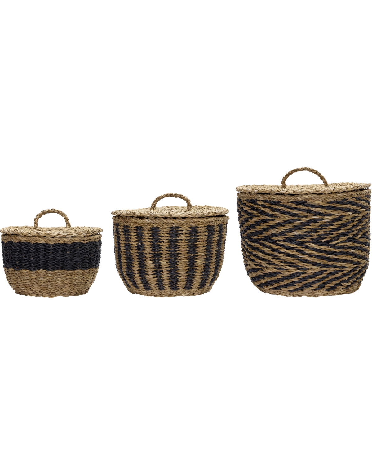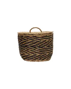 Opbevar med stil og personlighed med dette sæt med tre håndflettede kurve i søgræs med låg. De grafiske mønstre i natur og sort skaber et let boheme-look og giver dit hjem en legende elegance.- Håndflettet søgræs med låg- Tre forskellige grafiske mønstre- Med låg og praktisk hank- Sæt med tre kurveSkab ro og æstetik i din indretning – perfekte til småting, legetøj eller tørklæder.