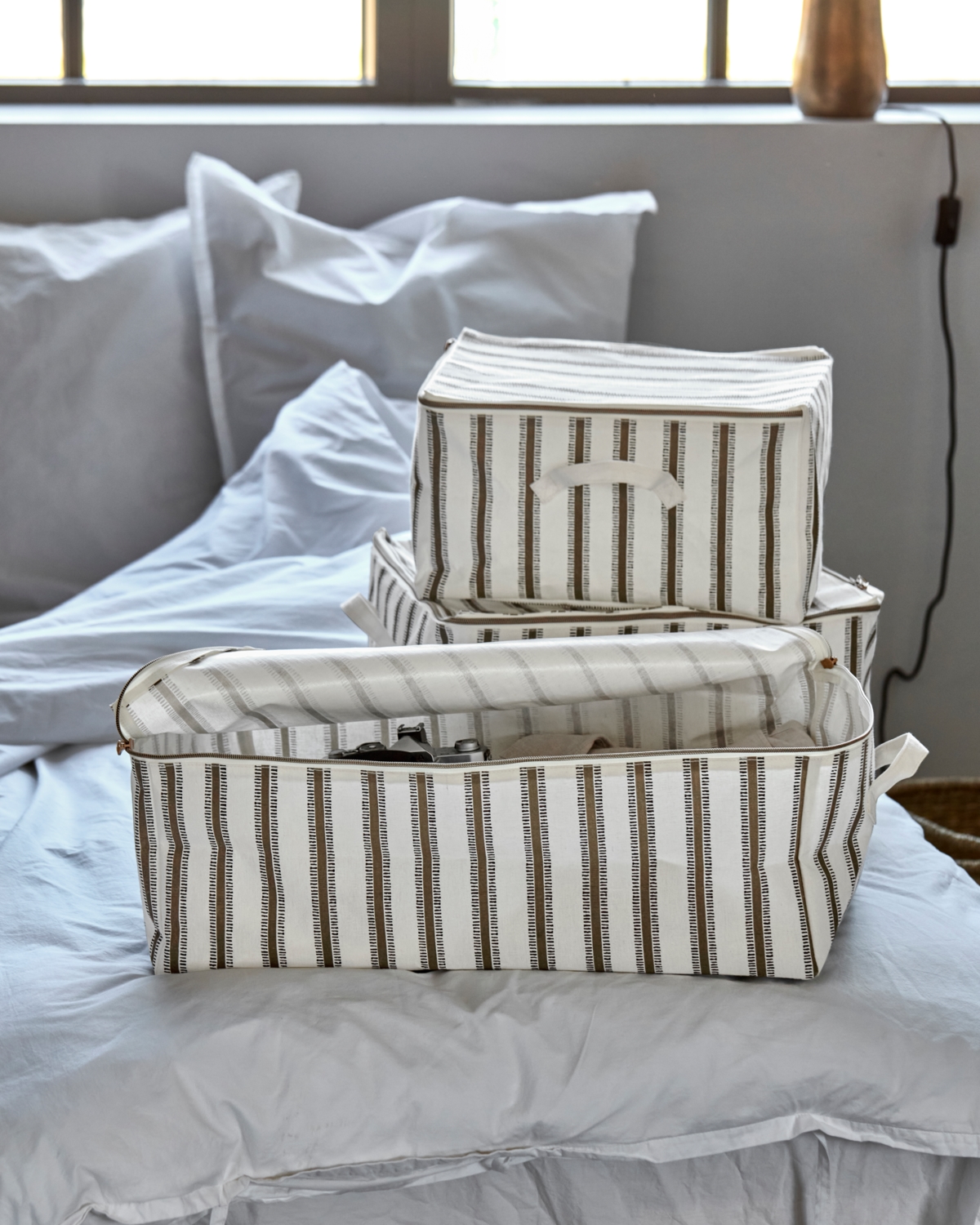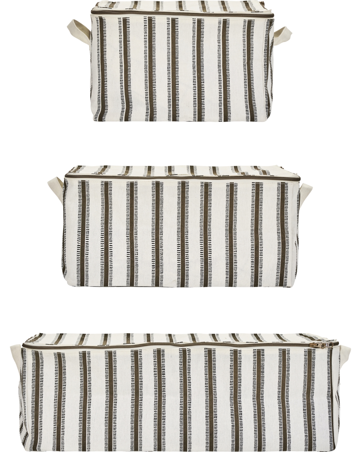 Bring en etnisk charme til dit hjem med disse lette opbevaringsløsninger. De er fremstillet af lærred og har en råhvid baggrund prydet med et smukt brunt etnisk print. Hver kasse har en praktisk lynlåslukning, som holder dine ting støvfri og samtidig giver nem adgang. Dette sæt består af tre størrelser, så du kan organisere dit rum med stil og alsidighed. Disse æsker er perfekte til soveværelser og opholdsrum og forener det praktiske med det æstetiske.- Letvægtsdesign i lærred- Sikker lynlåslukning- Etnisk print i brune nuancer- Sæt med tre alsidige størrelserOpgrader din opbevaringsløsning med stil og funktionalitet.
