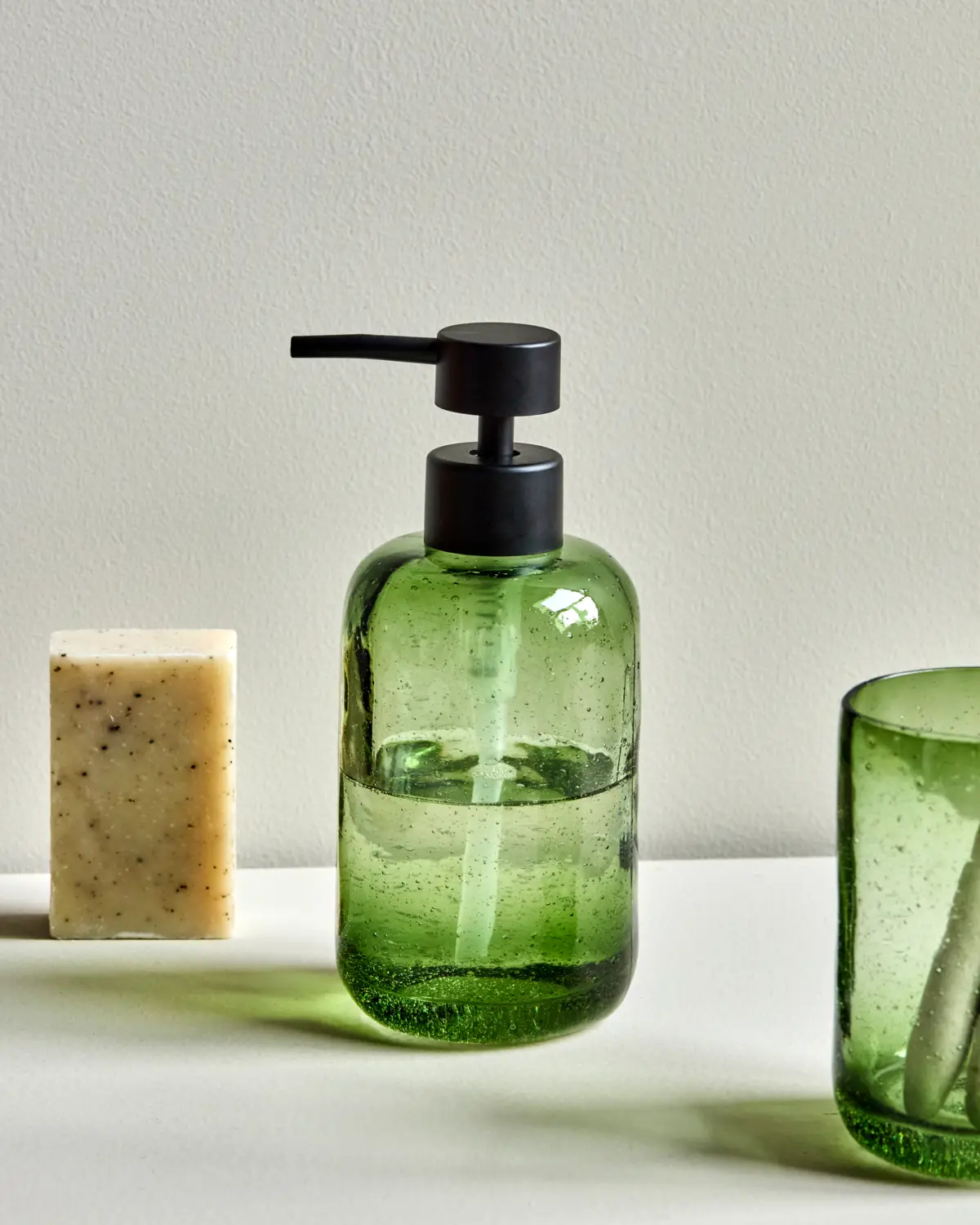 HDWah-sæbedispenseren er fremstillet i mørkegrønt glas med fine luftbobler og en matsort pumpe. Det minimalistiske design kombinerer holdbarhed med et raffineret udtryk.- Grønt glas med luftbobler.- Matsort pumpe.- Funktionelt design.