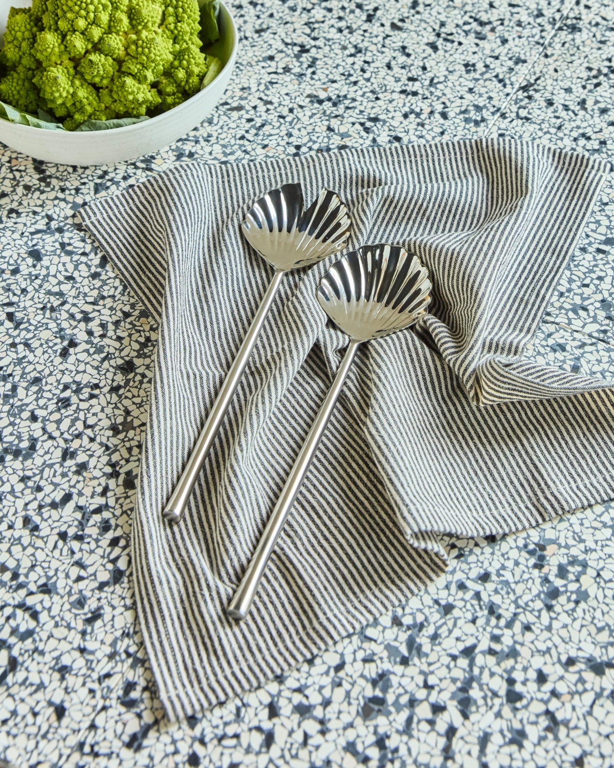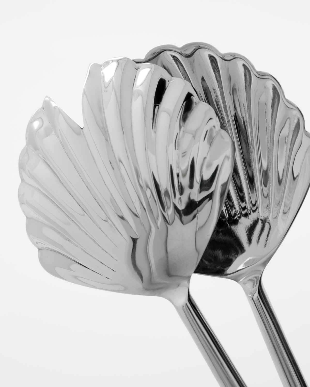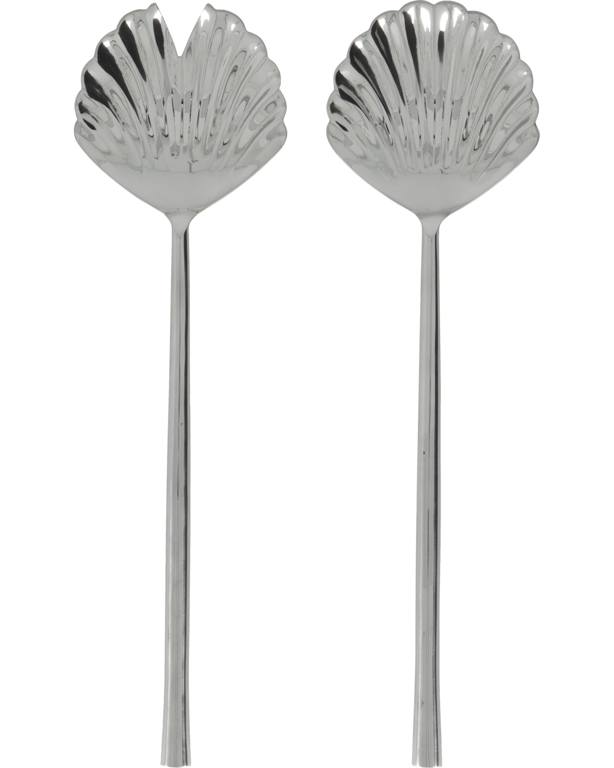Dette salatsæt er designet med hoveder formet som muslingeskaller. Det skulpturelle design giver et elegant og dekorativt udtryk.- Sæt med to dele.- Muslingeformet design.- Poleret rustfrit stål.
