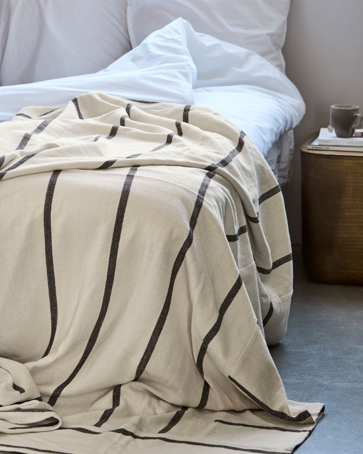 Indfør moderne charme i dit soveværelse med dette mørkebrune sengetæppe. Det er fremstillet af blødt bomuld og giver en luksuriøs fornemmelse, mens den råhvide baggrund med vævede brune striber giver et stilfuldt touch. Dette tæppe passer ind i alle moderne omgivelser og skaber en varm og indbydende atmosfære i dit soveværelse eller din stue.- Blødt bomuldsmateriale- Offwhite med brune striber- Moderne udseende- Perfekt til soveværelse eller stueTilføj et strejf af stil til dit hjem.