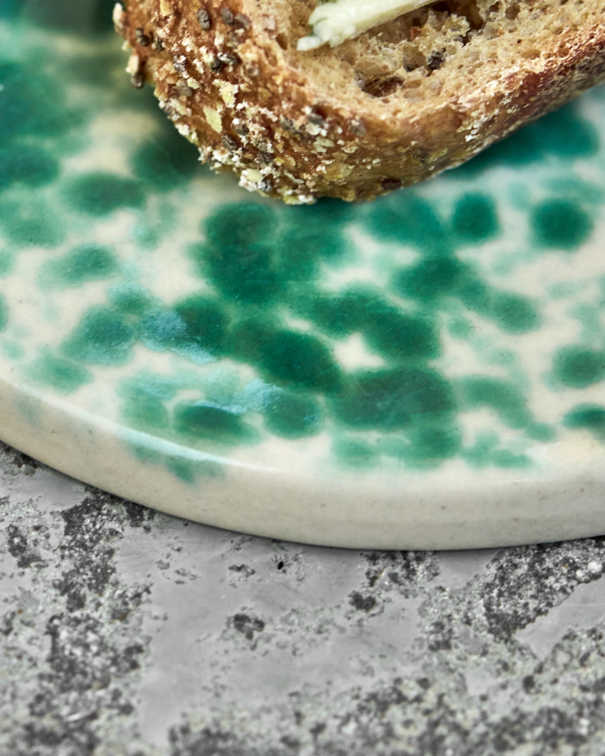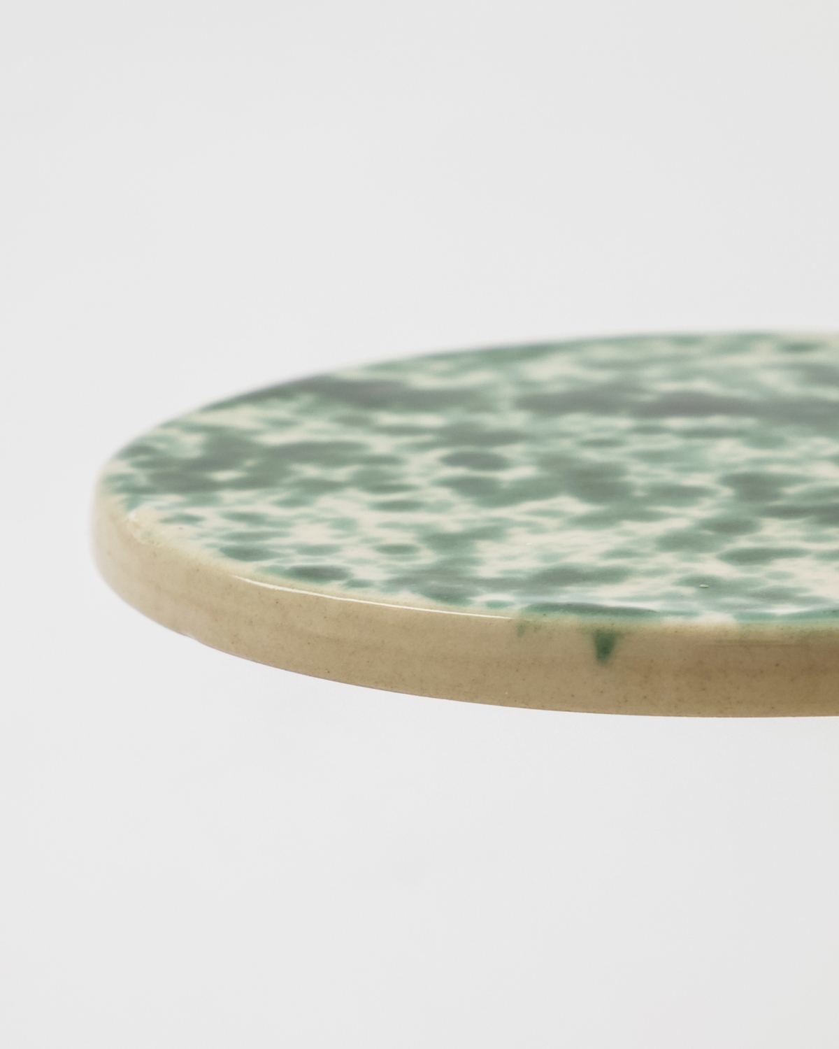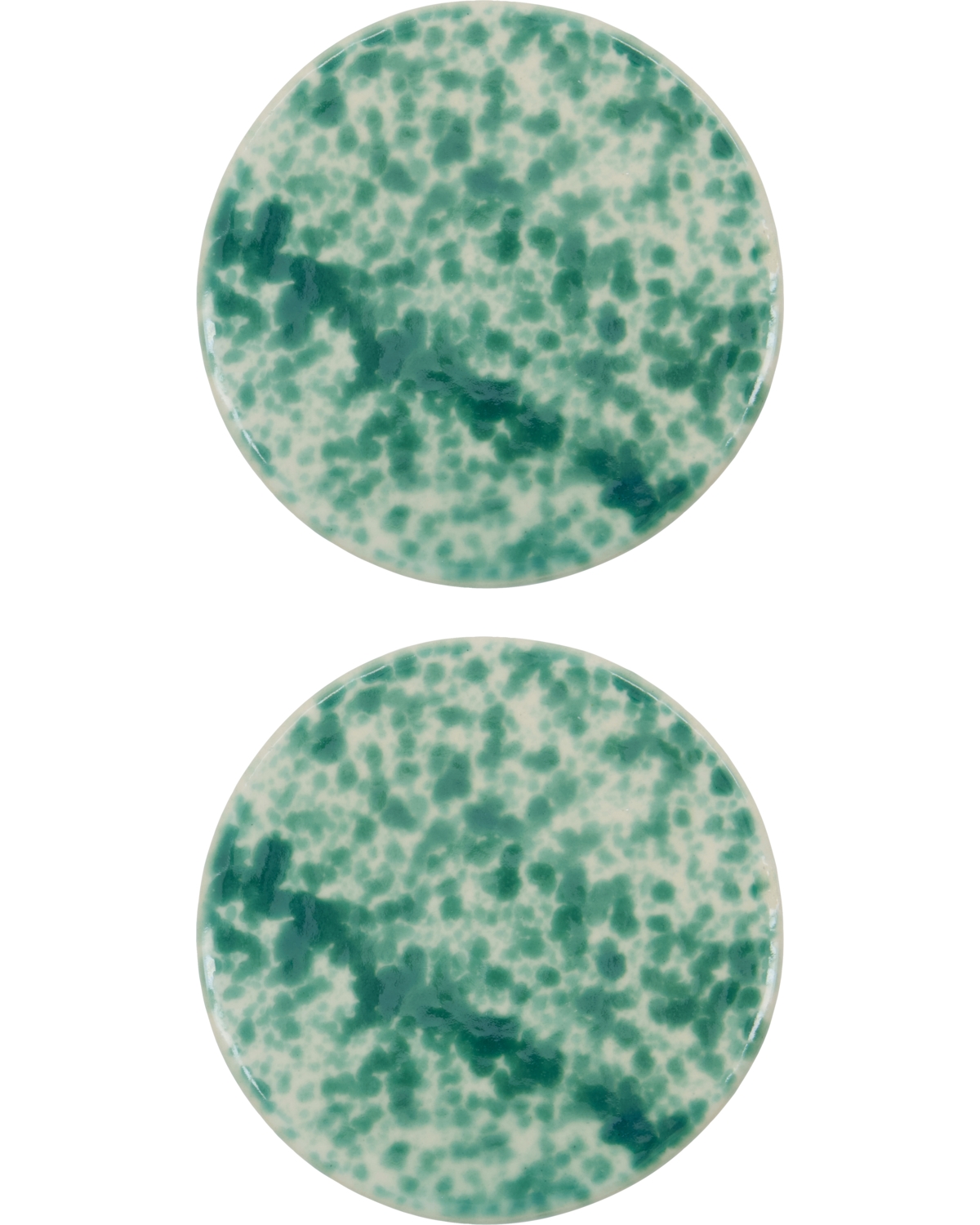Introducer et stænk af farve til dit spisebord med dette sæt med to keramiske serveringsbrætter. Disse runde stentøjsstykker har et slående håndmalet grønt stænkmønster, der tilføjer et strejf af kunstnerisk til ethvert måltid. Ideel til servering af tapas, ost eller desserter, de er perfekte som et delebræt for to, og passer smukt sammen med te, kaffe eller et glas vin. Deres moderne design og praktiske gør dem til en dejlig tilføjelse til din borddækning. - Håndmalet grønt stænkdesign - Alsidige serveringsmuligheder - Sæt med to dele - Moderne og praktisk stil Tilføj et levende præg på din madoplevelse.