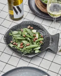 Dette udsøgte serveringsfad er håndlavet af stentøj og fremviser en tidløs matsort finish. Den elegante fiskeform tilføjer et strejf af kunstnerisk til dit bord og bringer en livlig atmosfære til din madoplevelse. Uanset om du serverer snacks, grøntsager eller hovedretter, tjener dette alsidige stykke ikke kun et praktisk formål, men beriger også den visuelle tiltrækning af dine kulinariske præsentationer. - Tidløs mat sort finish - Elegant fiskeform - Håndlavet stentøj - Perfekt til servering af fade Bring charme og stil til dit spisebord med dette smukke serveringsfad.