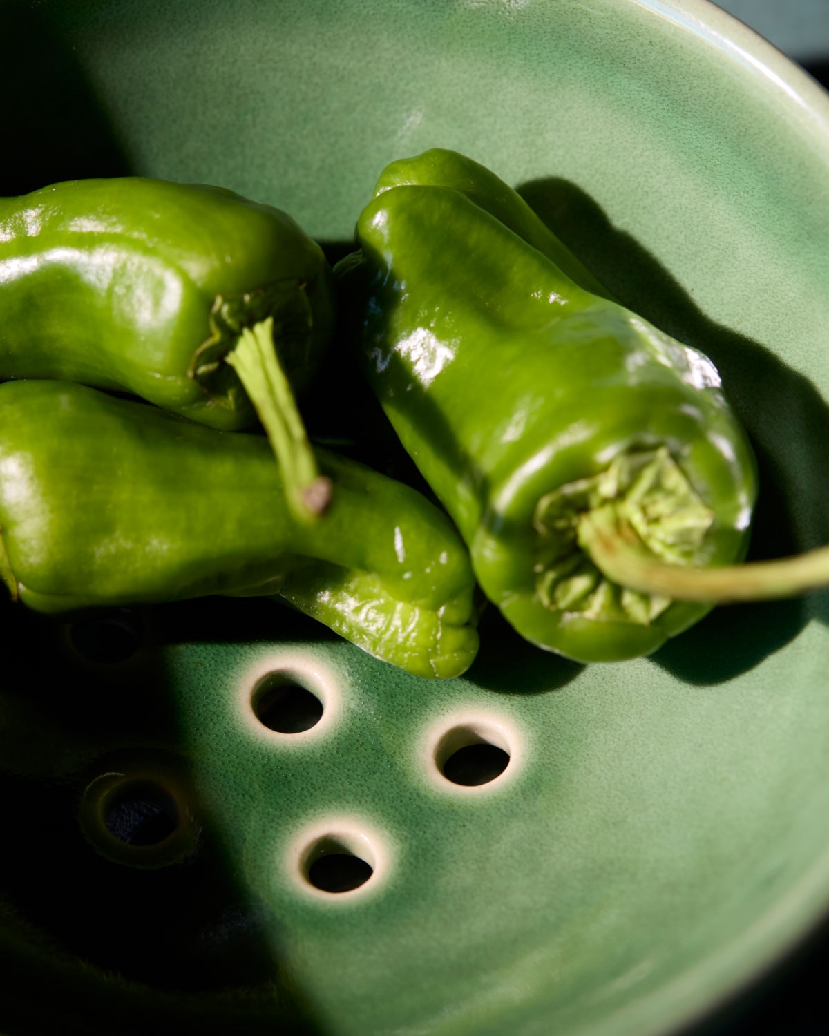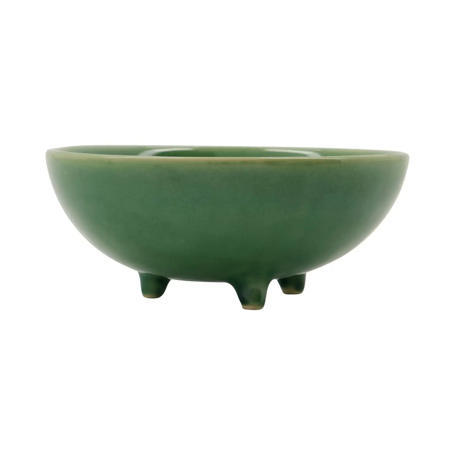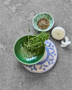 Skålens kompakte størrelse på 12 cm i diameter gør den nem at placere på bordpladen eller i køleskabet. Den håndlavede fremstillingsproces betyder, at hver skål har sit eget udtryk i den grønne finish. Stentøjsmaterialet er robust og velegnet til daglig brug, mens designet med de hævede ben tilføjer et skulpturelt element til dit køkken.