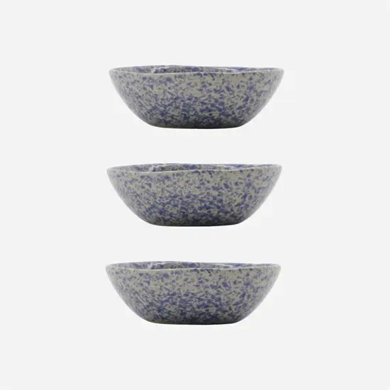 Dette sæt består af tre skåle fra House Doctor med en iøjnefaldende blå stænkeffekt. Hver skål er håndlavet og håndmalet, hvilket betyder, at mønsteret varierer fra skål til skål. De er lavet af 100 % stentøj med en diameter på 8,5 cm og en højde på 3 cm.