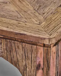 Introducer et element af tidløs charme til din stue med dette smukt udformede sofabord. Den er lavet af en blanding af genbrugstræ og MDF og har et fantastisk mønster af træpaneler, der fremhæver dygtigt håndværk. Det firkantede design gør det til en alsidig tilføjelse til ethvert rum, der tilfører dit hjem karakter og varme. - Lavet af genbrugstræ og MDF - Unikt, tidløst træmønster - Firkantet design til alsidig brug - Naturlig farve komplementerer interiør Lad dette sofabord bringe et strejf af elegance og unikhed til din boligindretning.