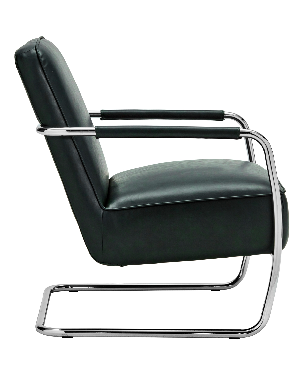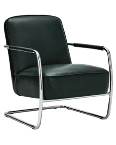 Tilføj et strejf af moderne komfort i din stue med denne loungestol i elegant mørkegrøn. Den polstrede sidde- og rygflade i læderlook giver en luksuriøs følelse, mens det slanke, bøjede kromstel skaber et svævende udtryk. Brug den som din nye favoritplads til at læse, nyde kaffen eller slappe af med et glas vin, enten i stuen, i hjørnet af soveværelset eller som et stilfuldt statement i kontoret.- Unikt stel i bøjet krom.- Læderlook for en eksklusiv følelse.- Betrukne, komfortable armlæn.- Perfekt til stue og afslapning.Skab ro og stil i din indretning med denne moderne klassiker.