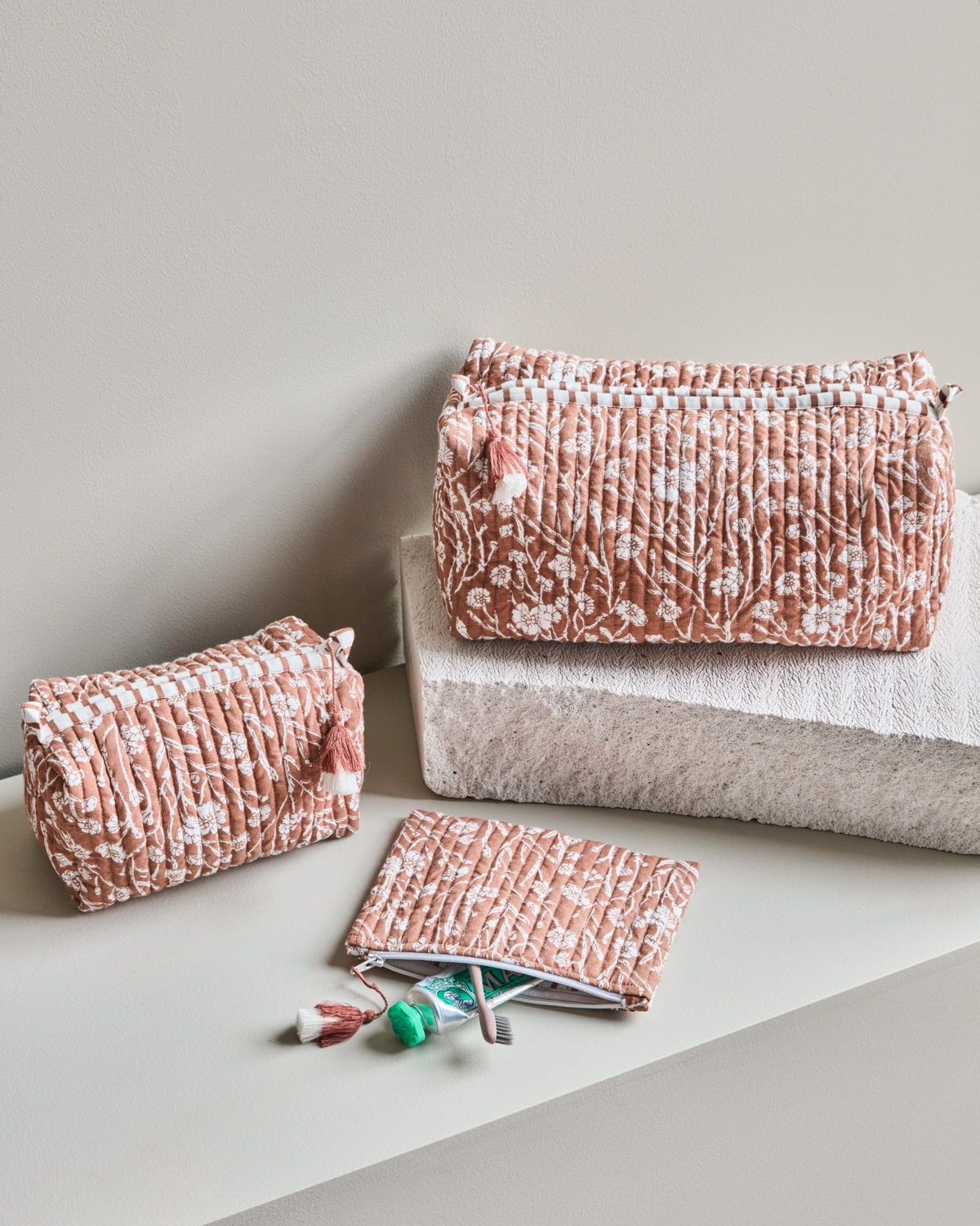 Hold styr på dine toiletsager med HDCare-sættet, som består af 3 toilettasker i bomuld med et diskret mønster i en afdæmpet rosa farve. Deres praktiske størrelse gør dem ideelle til opbevaring af skønhedsprodukter eller til det mest nødvendige på rejsen.- Sæt med 3.- Håndlavede detaljer.- Afdæmpet rosa farve.- Rejsestørrelser.- Vaskes i hånden.