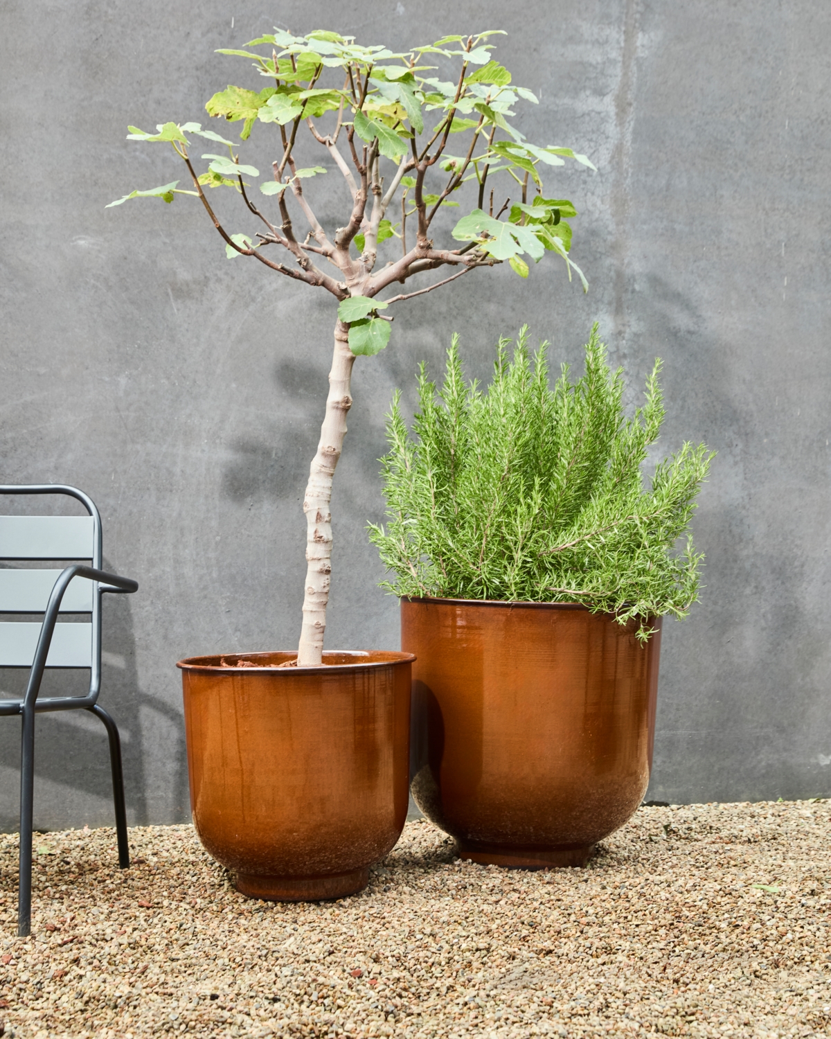 Sæt af to lette krukker i jern. De har en dyb, brun farve med en blank overflade, der smukt reflekterer lyset. Deres afrundede form og skinnende finish skaber kontrast og dybde i indretningen. Krukkerne har praktiske drænhuller i bunden.- Sæt med to.- Blank, brun overflade.- Afrundet silhuet- Drænhuller.- Kan bruges både inde og ude.