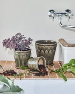 Disse HDCora-lertøjskrukker har en elegant, grå glasur og et geometrisk mønster, der fremhæver dine grønne planter. - Sæt med 3 krukker.- Gråglaseret lertøj.- Geometrisk mønster med tekstur
