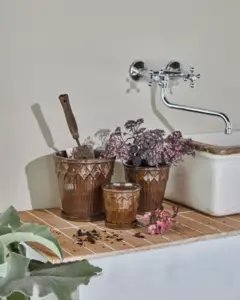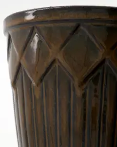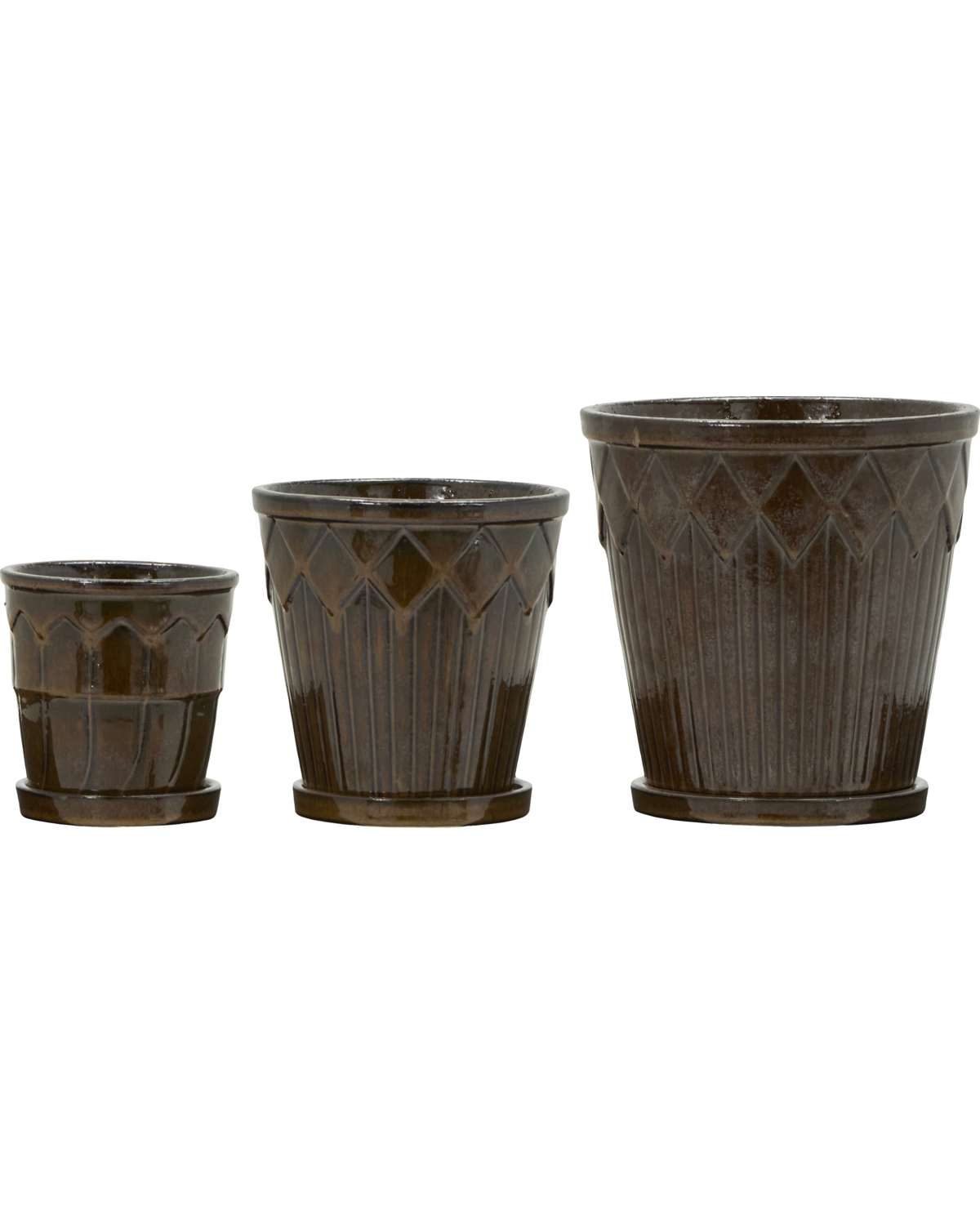 HDCora-lertøjskrukkerne er designet med en dybbrun glasur og et geometrisk mønster der tilfører personlighed og dybde til indretningen. Sæt med tre. - Sæt med 3 krukker.- Glaseret lertøj.- Fint, geometrisk mønster.