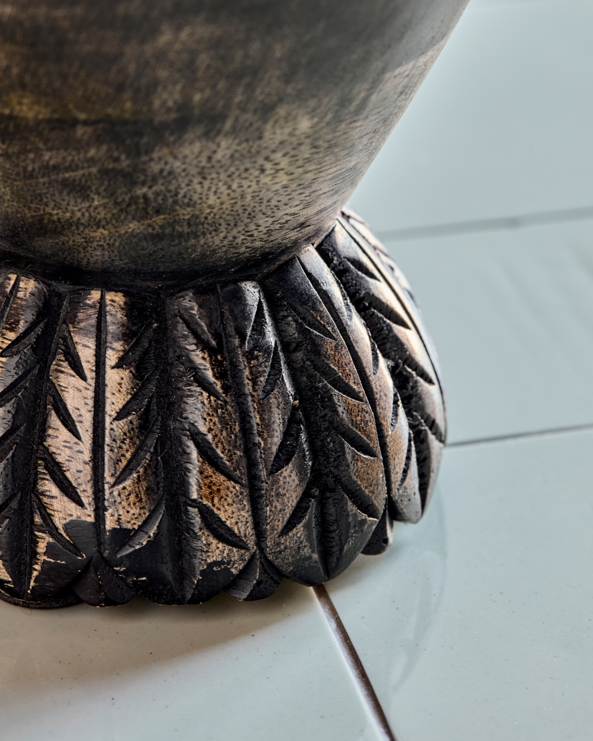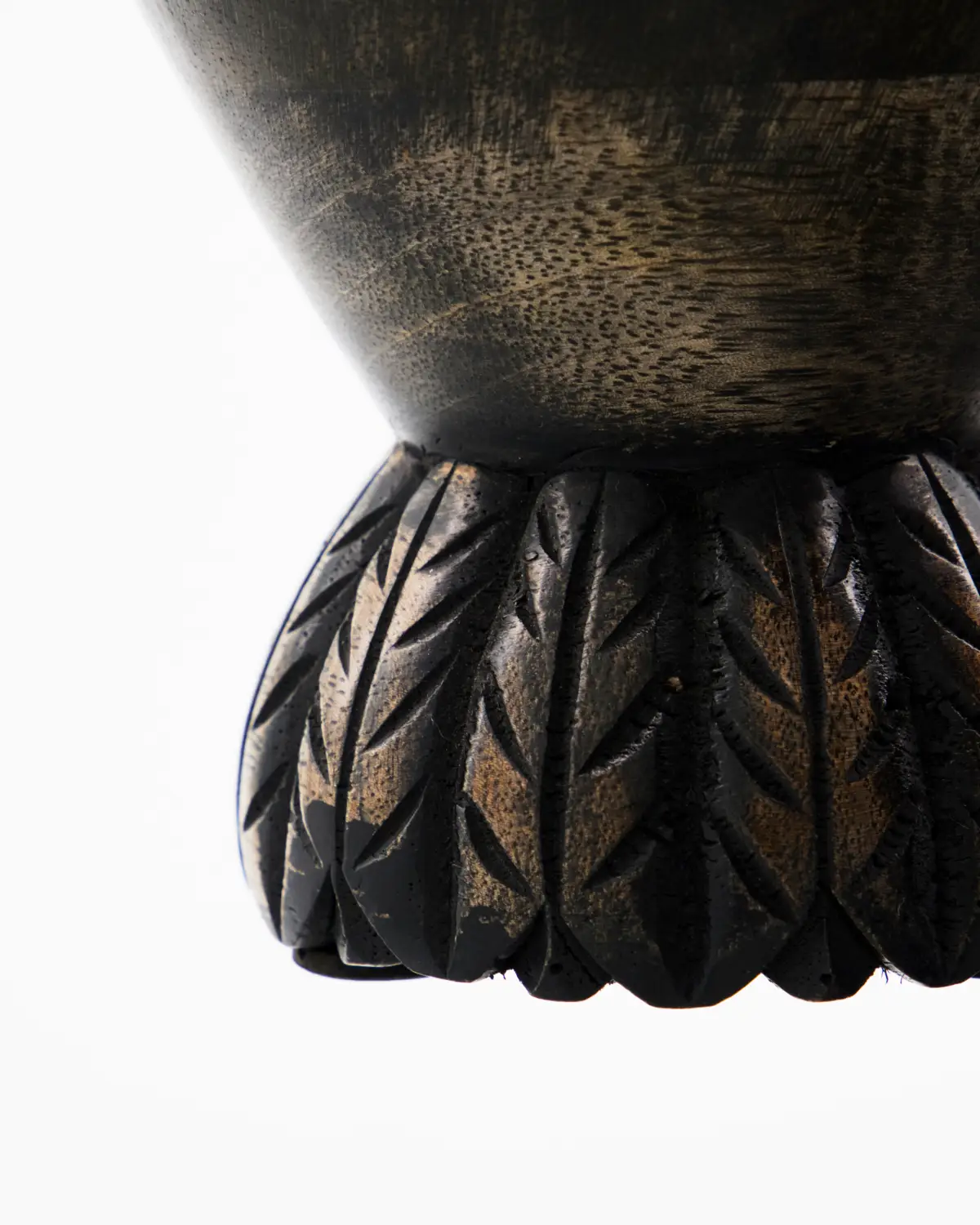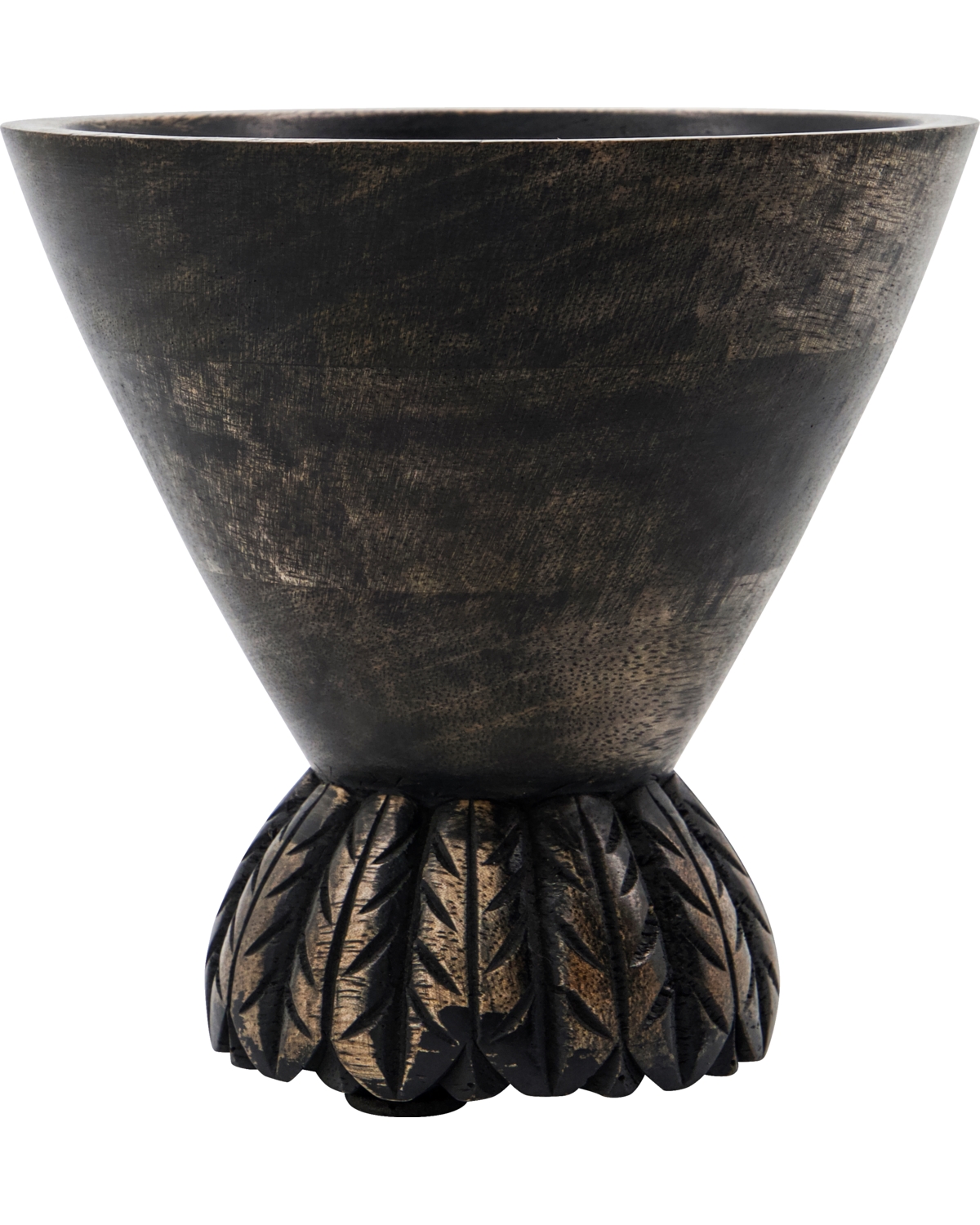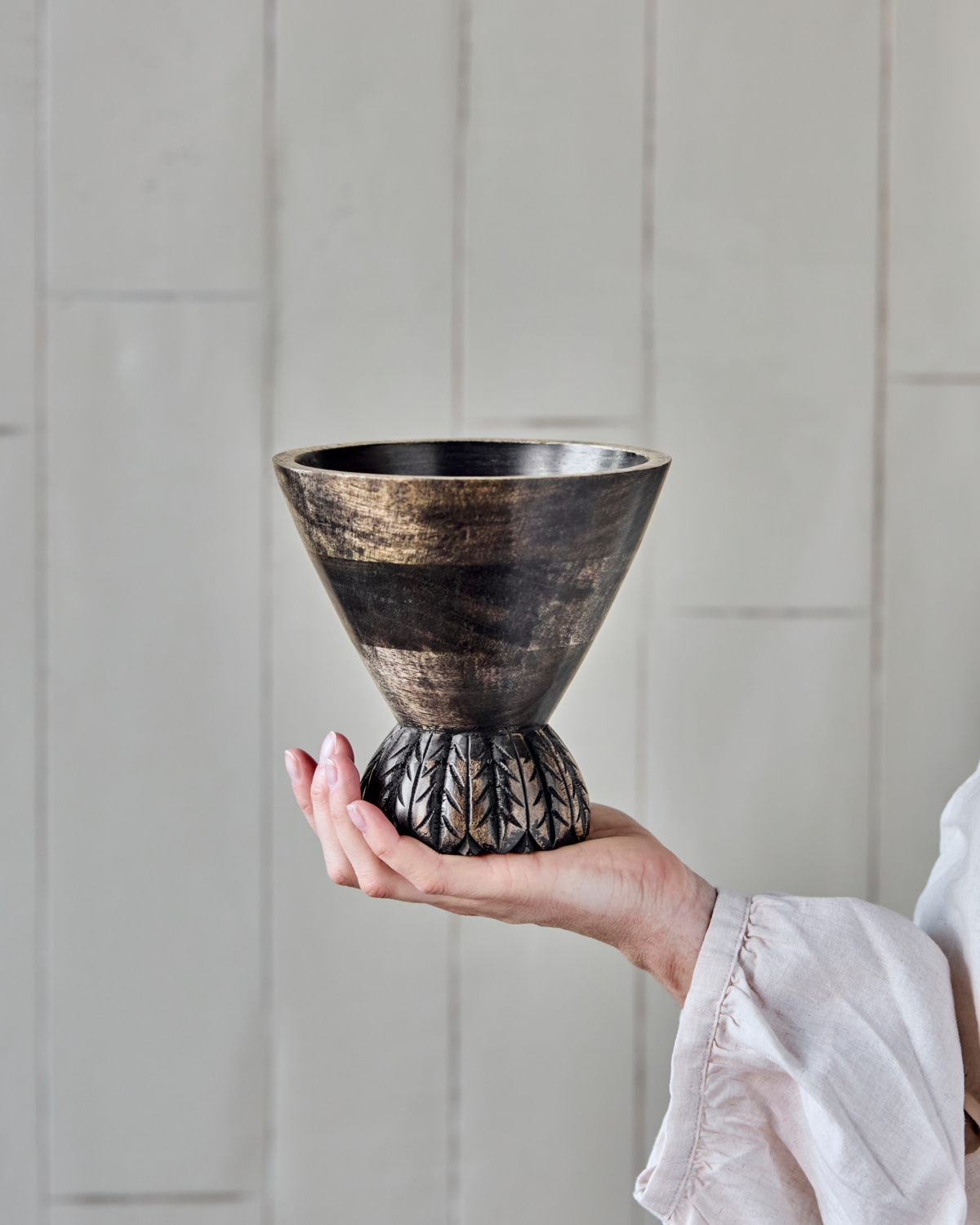 Fremhæv dine yndlingsgenstande med en håndlavet skål i sortbejdset mangotræ.Den koniske form og den solide fod skaber et markant blikfang på spisebordet eller som dekoration i stuen.Brug den med planter, tørrede blomster, eller skab et personligt arrangement til særlige lejligheder.Vi anbefaler plastindsats, hvis du vælger at plante i skålen.- Håndlavet kvalitet.- Mangotræ i sort finish.- Unik konisk form.- Velegnet til dekoration.Skab en personlig stemning i din indretning – kun fantasien sætter grænser.