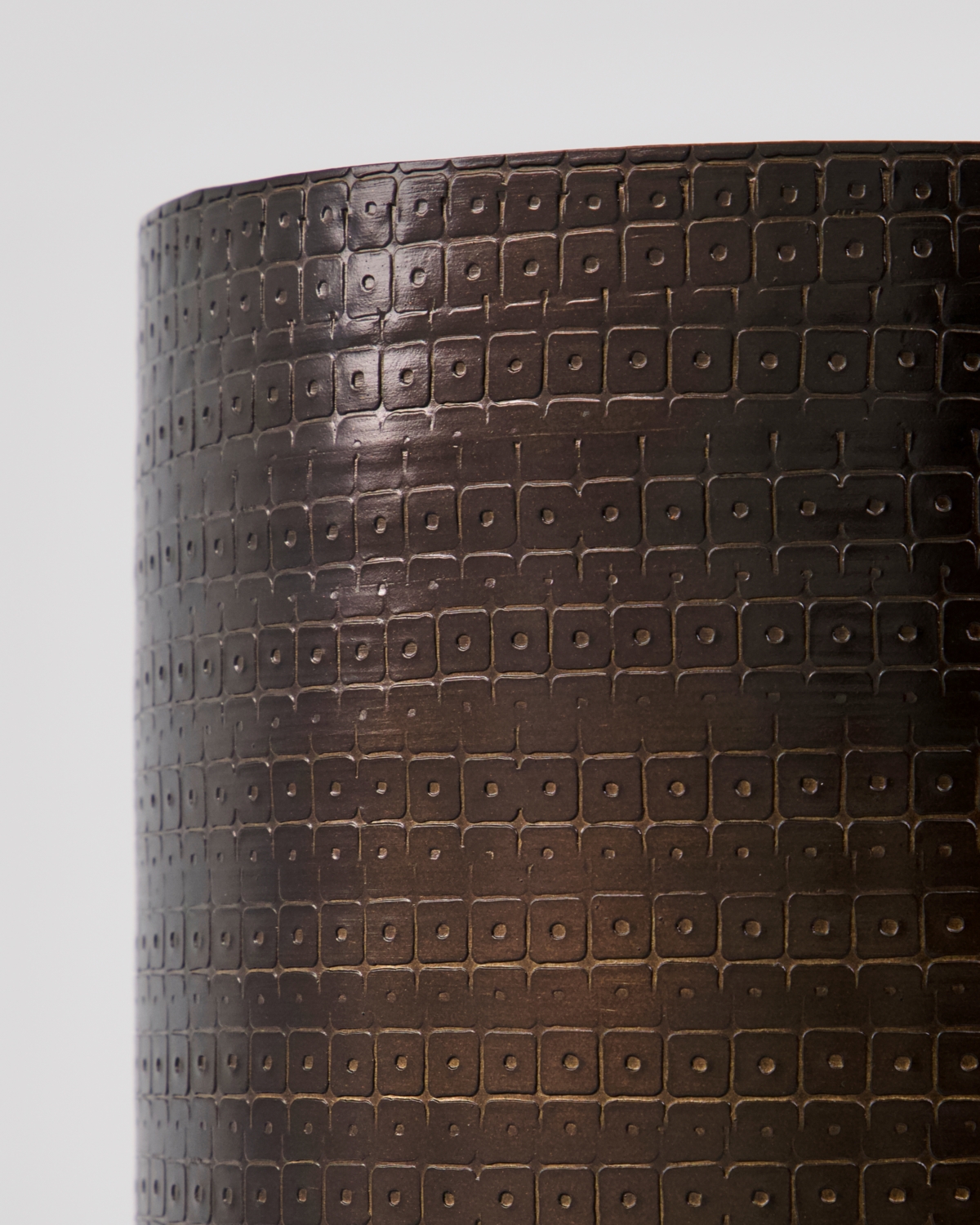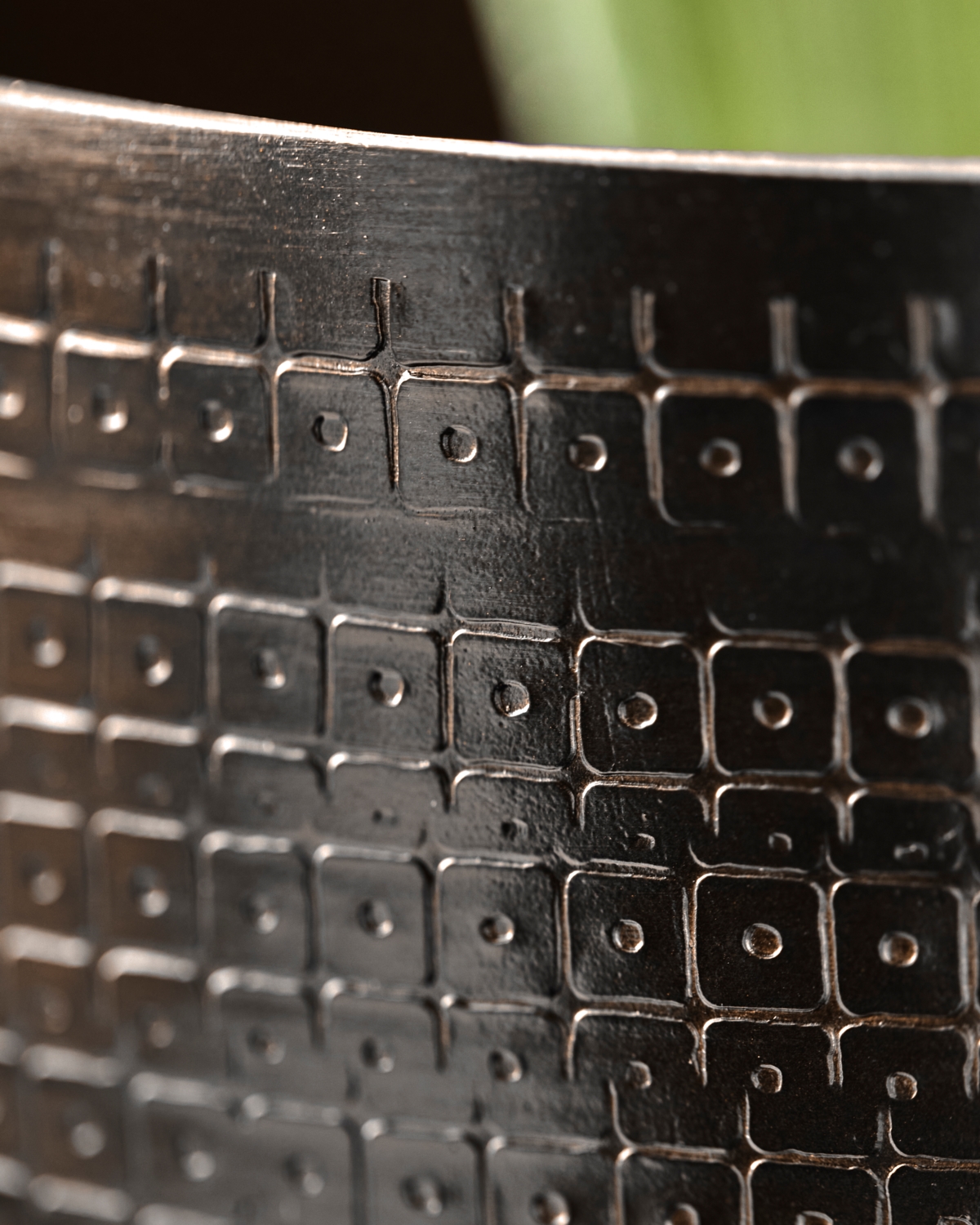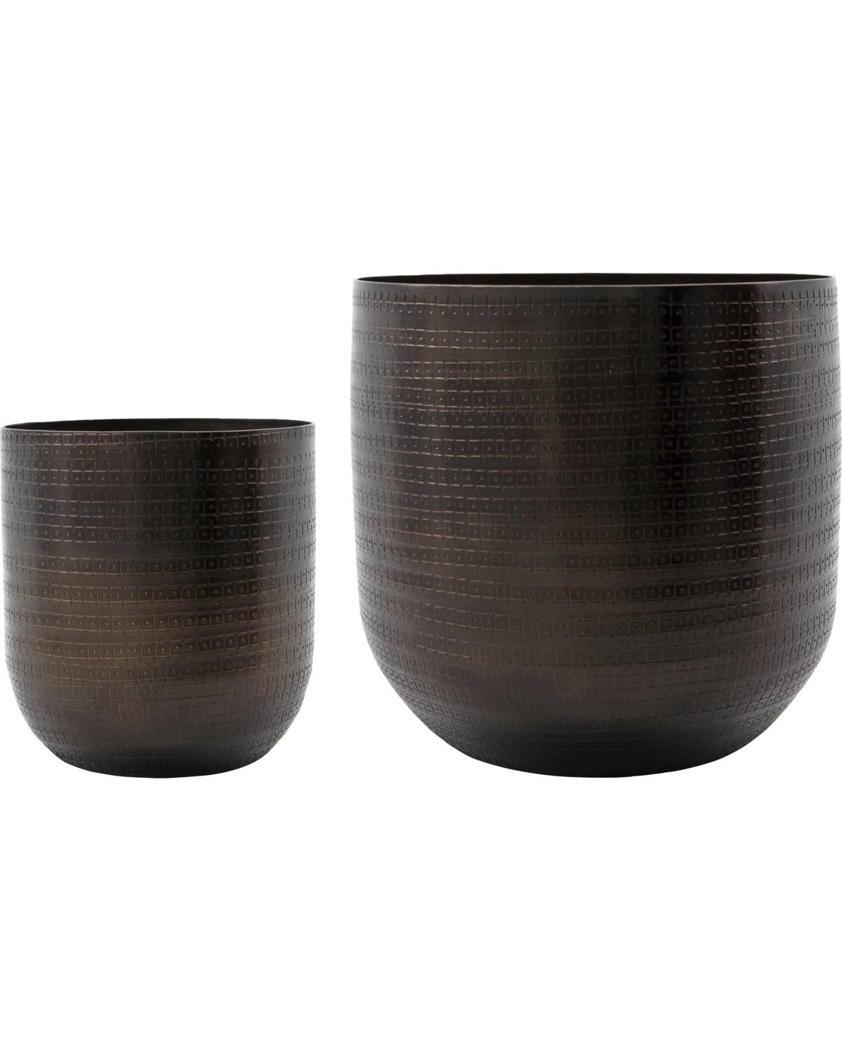 Giv din indretning karakter og charme med dette udsøgte sæt krukker, der er designet til at supplere både grønne og blomstrende planter. Hver krukke er fremstillet af aluminium og har en antikbrun finish og et indviklet, præget mønster. De håndlavede krukker giver et strejf af elegance og raffinement til din bolig og gør den mere attraktiv.- Håndlavet præget design- Antik brun finish- Aluminiumsmateriale- Sæt med to størrelserTilføj en stilfuld accent til dit hjem med disse smukke plantekasser.