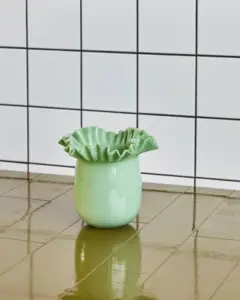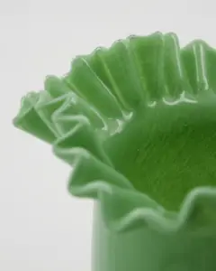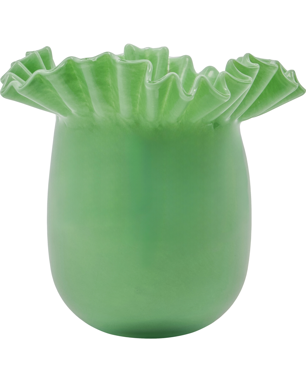 Den glatte overflade på denne håndlavede vase i grønt glas får et smukt modspil fra den iøjnefaldende, bølgede kant.- Håndlavet glas i en dyb, grøn nuance.- Bølget, skulpturel kant.