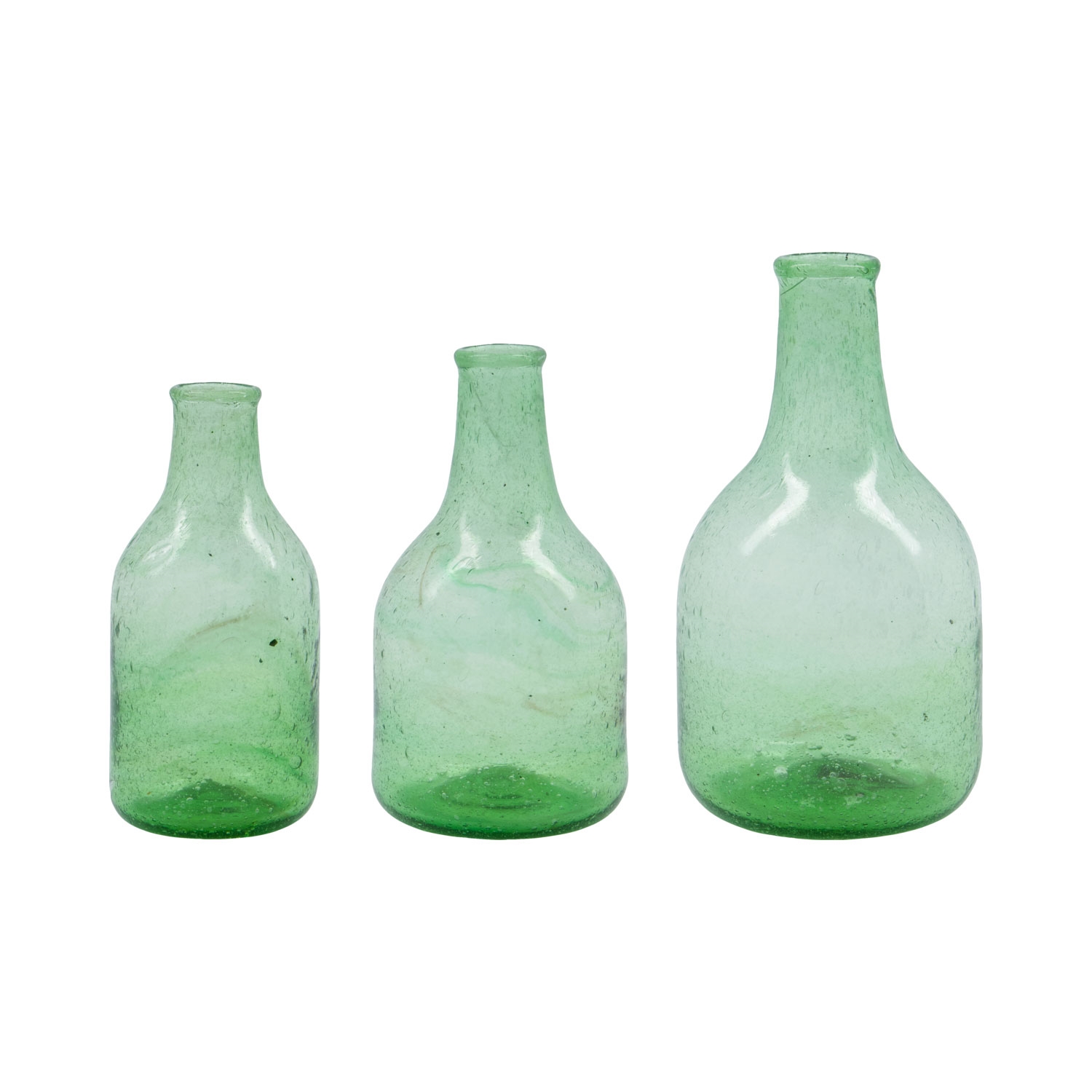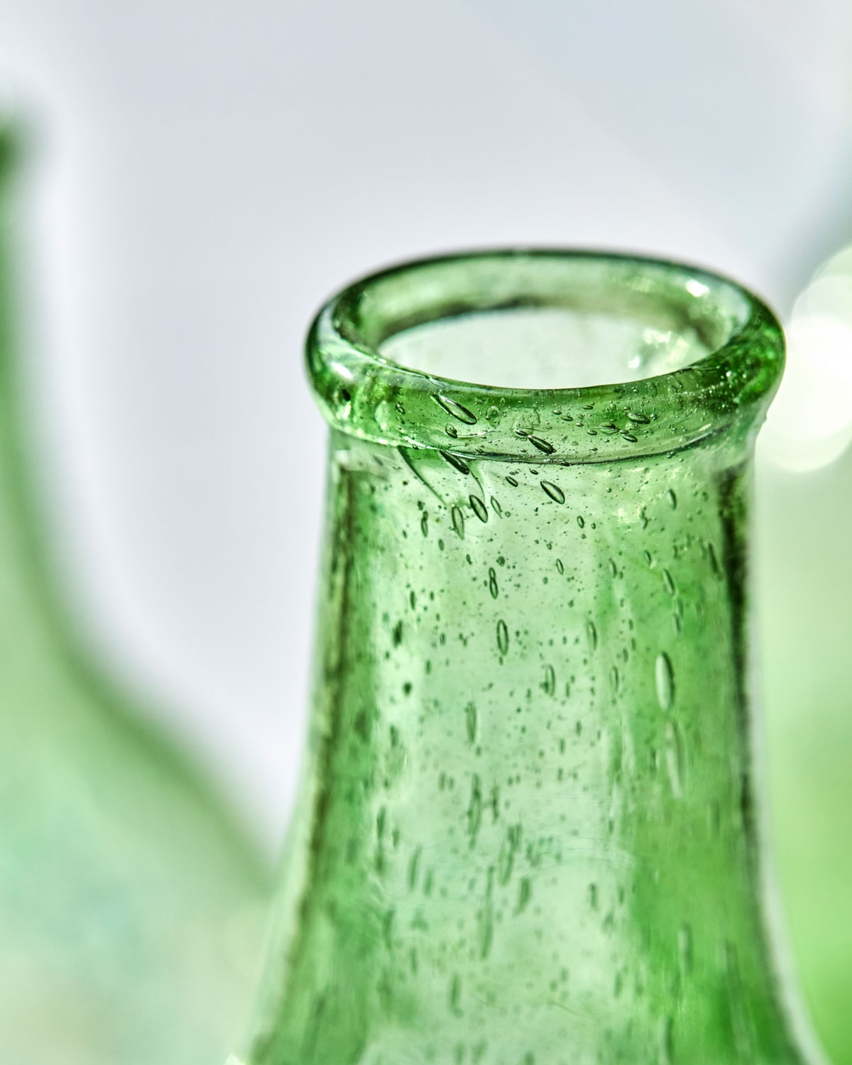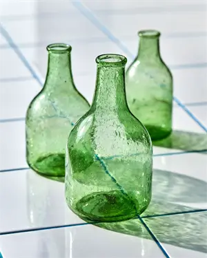Hver vase i dette sæt er håndlavet i mundblæst bobleglas, hvilket giver en tekstureret overflade med synlige bobler. De tre vaser er lavet af 100 % glas og har en levende grøn farve, der bringer friskhed til din indretning.