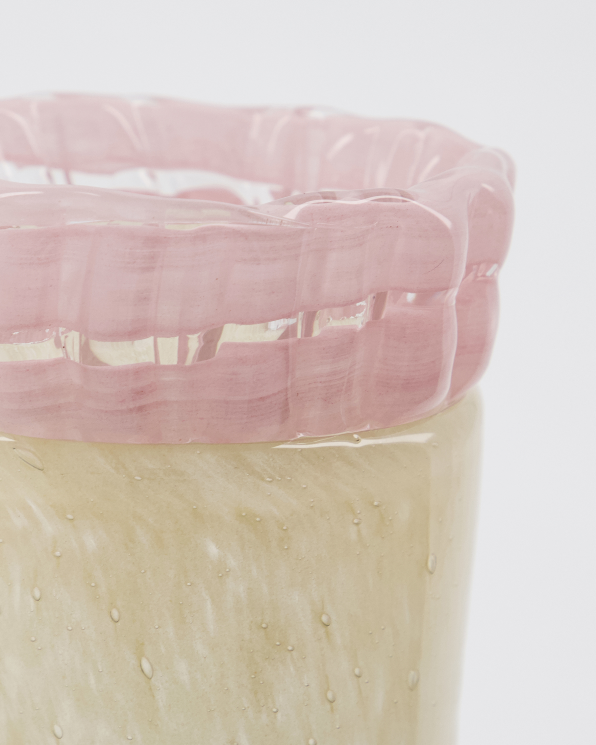 "Denne beige glasvase er håndlavet med upåklageligt håndværk og tilfører dit hjem et levende præg. Dens unikke bobleglasstruktur og den bløde, rosafarvede, buede kant skaber en kunstnerisk kontrast, der fanger opmærksomheden og tilfører charme. Brug den til at udstille blomster eller som fyrfadsstage for at skabe en varm, indbydende glød i din bolig.- Håndlavet