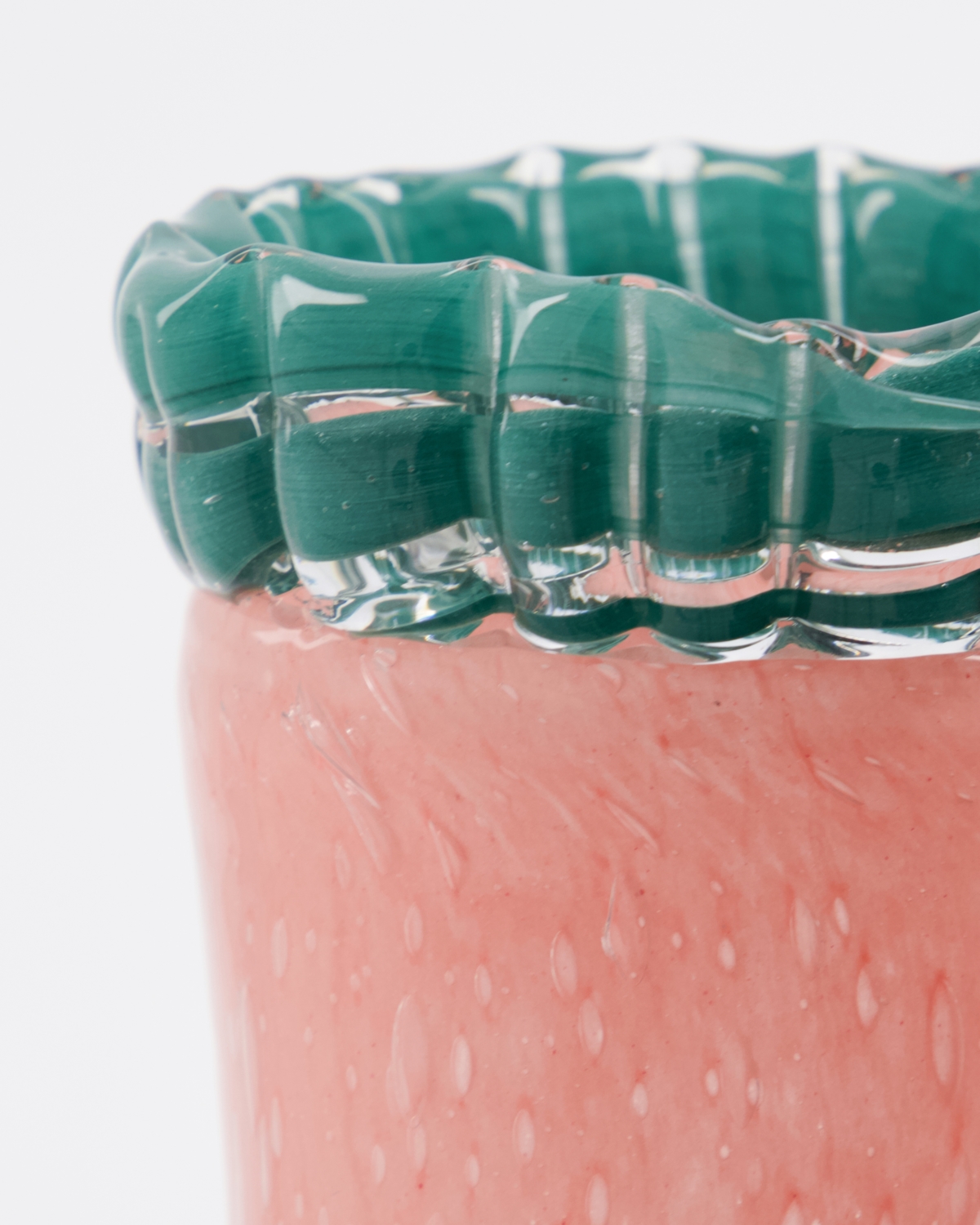 Denne rosa glasvase er håndlavet med præcision og tilfører varme og charme til dit hjem. Den boblende glasstruktur og den karakteristiske grønne kant giver en unik visuel appel, der er perfekt til at lyse op i din bolig. Brug den som vase eller fyrfadsstage for at tilføje et strejf af personlighed til din indretning denne sæson.- Håndlavet bobleglas-design- Unik pink og grøn farve- Alsidig indretning- Tilfører charme og personlighedBring et strejf af kunstnerisk flair til din stue eller spiseplads med denne fantastiske vase.