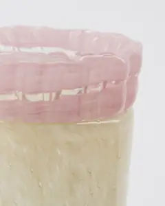 Giv dit hjem et strejf af charme med denne håndlavede beige glasvase. Den har en unikt designet lyserød, buet kant og tilføjer et legesygt strejf af farve til ethvert rum. Den boblende glasstruktur sikrer, at hvert stykke er helt unikt og giver et dejligt visuelt element til din indretning. Uanset om den bruges som vase eller fyrfadsstage, giver den varme og personlighed til din indretning. - Unikt håndlavet design - Beige glas med pink kant - Fungerer som vase eller fyrfadsstage - Tilfører charme og farve Inkorporer denne sæsons uundværlige stykke i din boligindretning!