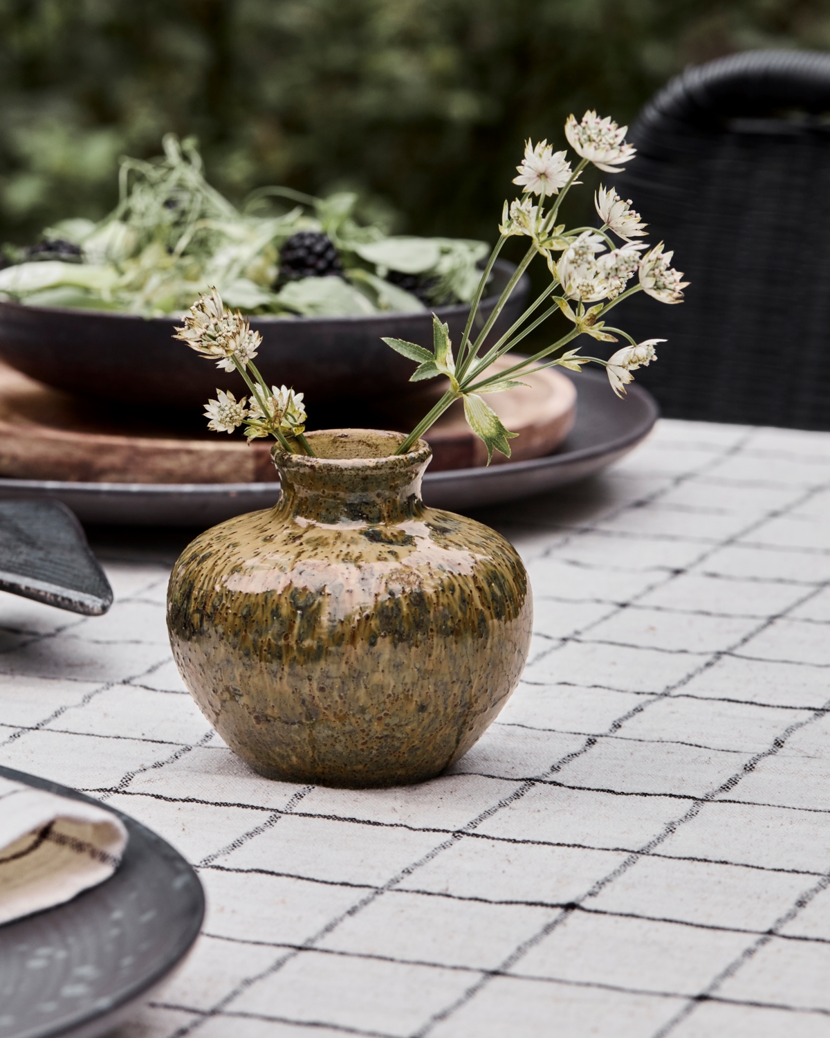 Tilføj et strejf af håndværksmæssig charme til din boligindretning med dette håndlavede keramikstykke. Den har en fantastisk glasur i brune nuancer og er perfekt til at fremvise en lille buket eller som et dekorativt element i sig selv. Dets håndlavede karakter sikrer, at hvert stykke er unikt med variationer i finish, farve og størrelse, så det bliver en helt unik tilføjelse. Sæt den sammen med andre små vaser for at skabe et iøjnefaldende arrangement.- Håndlavet med unik glasur.- Perfekt til små buketter- Smukke brune nuancer- Ideal for decorative arrangementsBring håndværksmæssig charme til din indretning med denne udsøgte keramikvase.