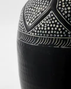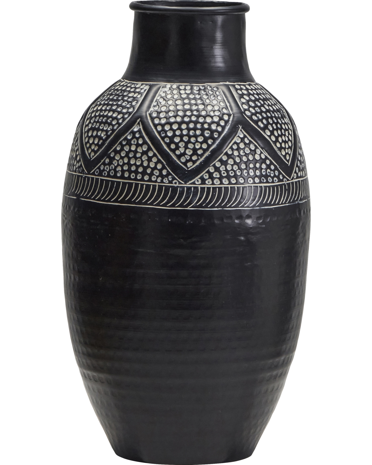 Håndlavet med en sort finish er denne vase et lille kunstværk, der tilføjer varme og personlighed til din bolig. Det smukt embossed mønster gør hver vase unik og ideel til både store blomsterbuketter og dekorative grene.- Unik håndlavet design- Sort aluminium finish- Smukt embossed mønster- Perfekt til buketter og greneGiv dit hjem et kunstnerisk præg med denne vase.